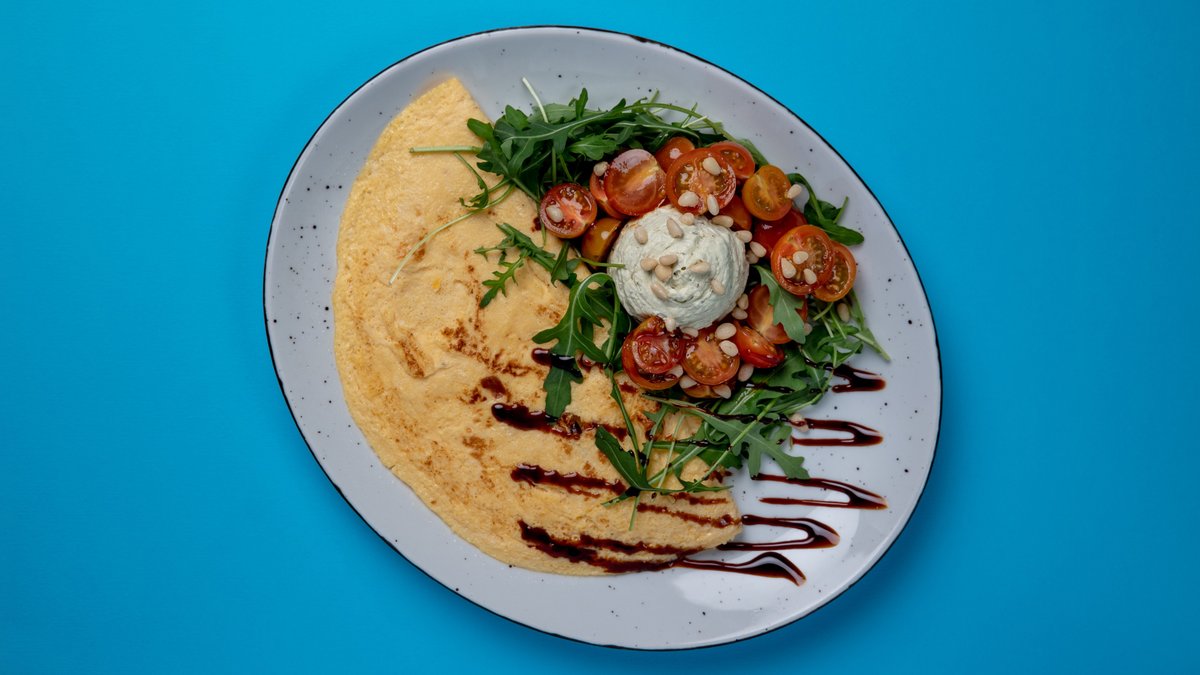 Jaja, mleko, pavlaka, čeri paradajz, rukola, spanać, krem sir, pesto, pinjoli, balzamiko krema, suncokretovo ulje, so, biber. (280 g) Prikaz jela prilikom dostave može biti izmenjen.