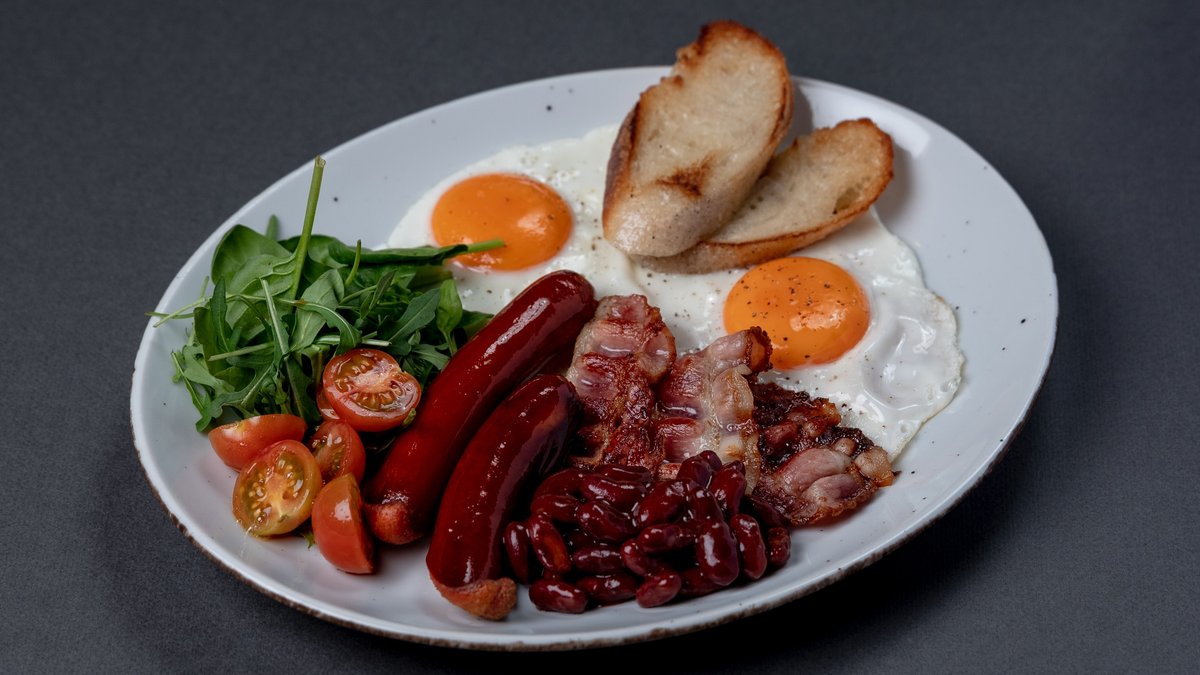 Jaja, so, biber, suncokretovo ulje, crveni pasulj, kobasice, slanina, spanać, rukola, čeri paradajz, hleb. (280 g) Prikaz jela prilikom dostave može biti izmenjen.