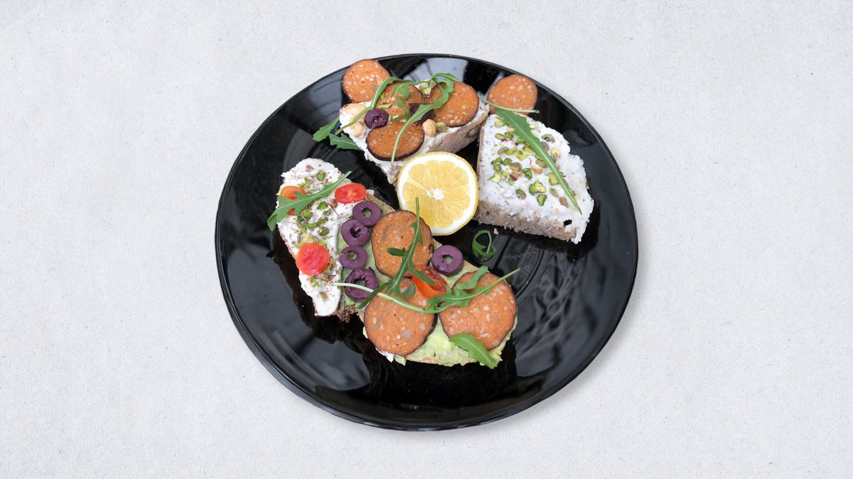 Hleb od kiselog testa,krem sir od indijskog oraha, čeri paradajz,avokado,tamari sos,origano ,rukola,seckani brazilski orah.