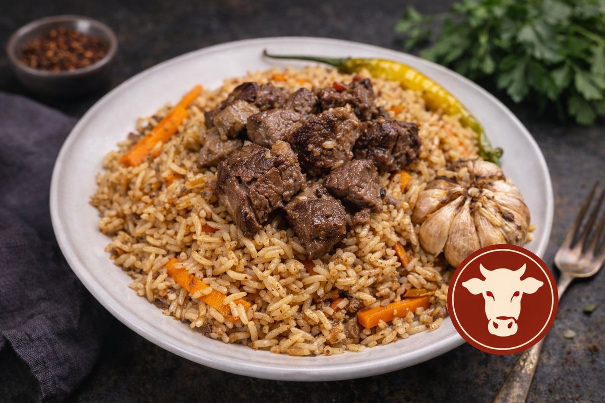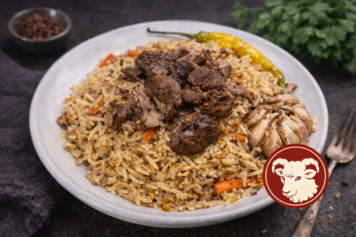 Velika porcija srednjeazijskog pilava sa jagnjetinom — dovoljno za 2–3 osobe. Sporo kuvano, bogatog ukusa, spremno za deljenje. 1kg