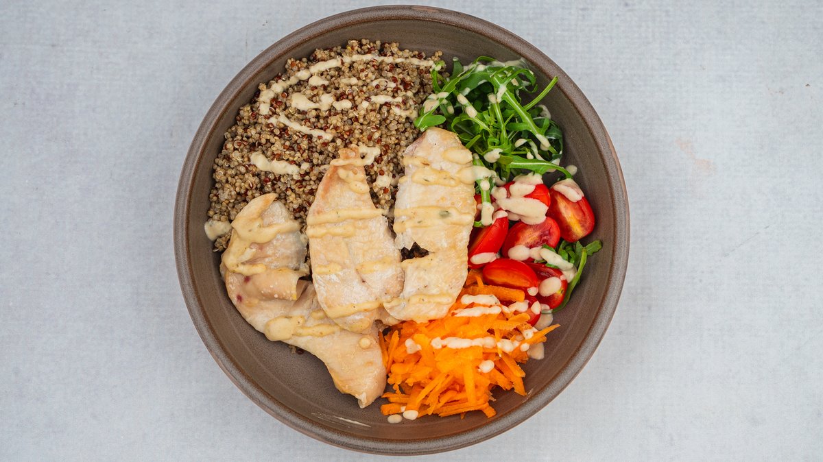 kuvana kinoa, rukola, šargarepa, čeri paradajz, pileći file, dresing od bademovog putera