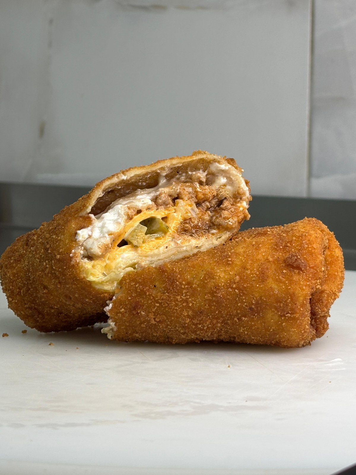 Velika pohovana palačinka sa mlevenim mesom, pavlaka i Gauda sir