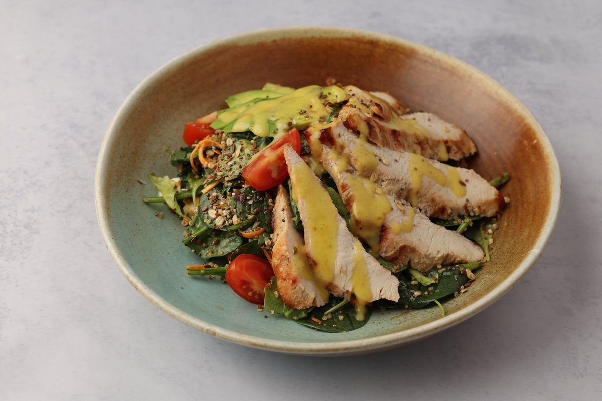 Miks salata, piletina, kikiriki puter, goveđa pršuta, paprika, baby mocarela, mango i lajm dresing, šargarepa