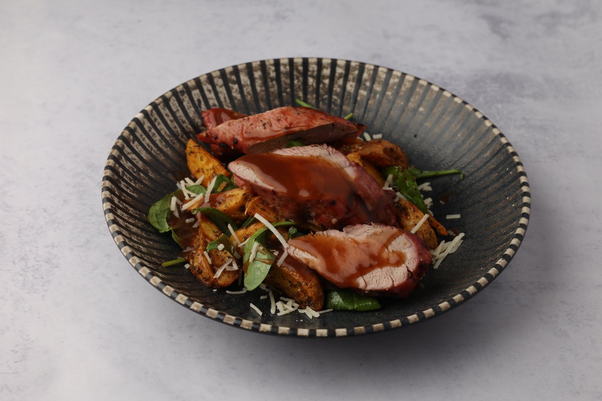 Grilovani biftek sa pršutom, čedar sirom, mariniranim lukom, dresingom, salatom i pomfritom
