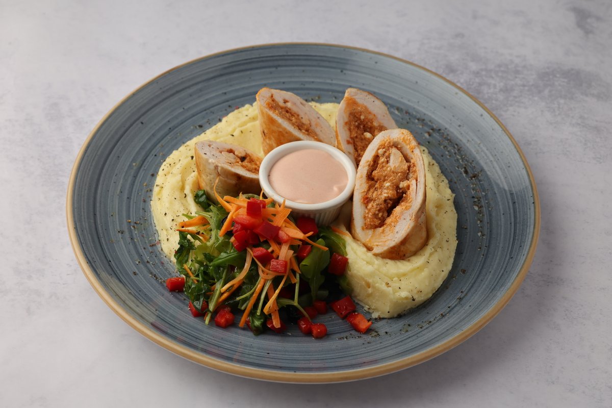 Grilovana piletina sa miksom salata, dresinzima, feta i čedar sirom, pestom i pomfritom