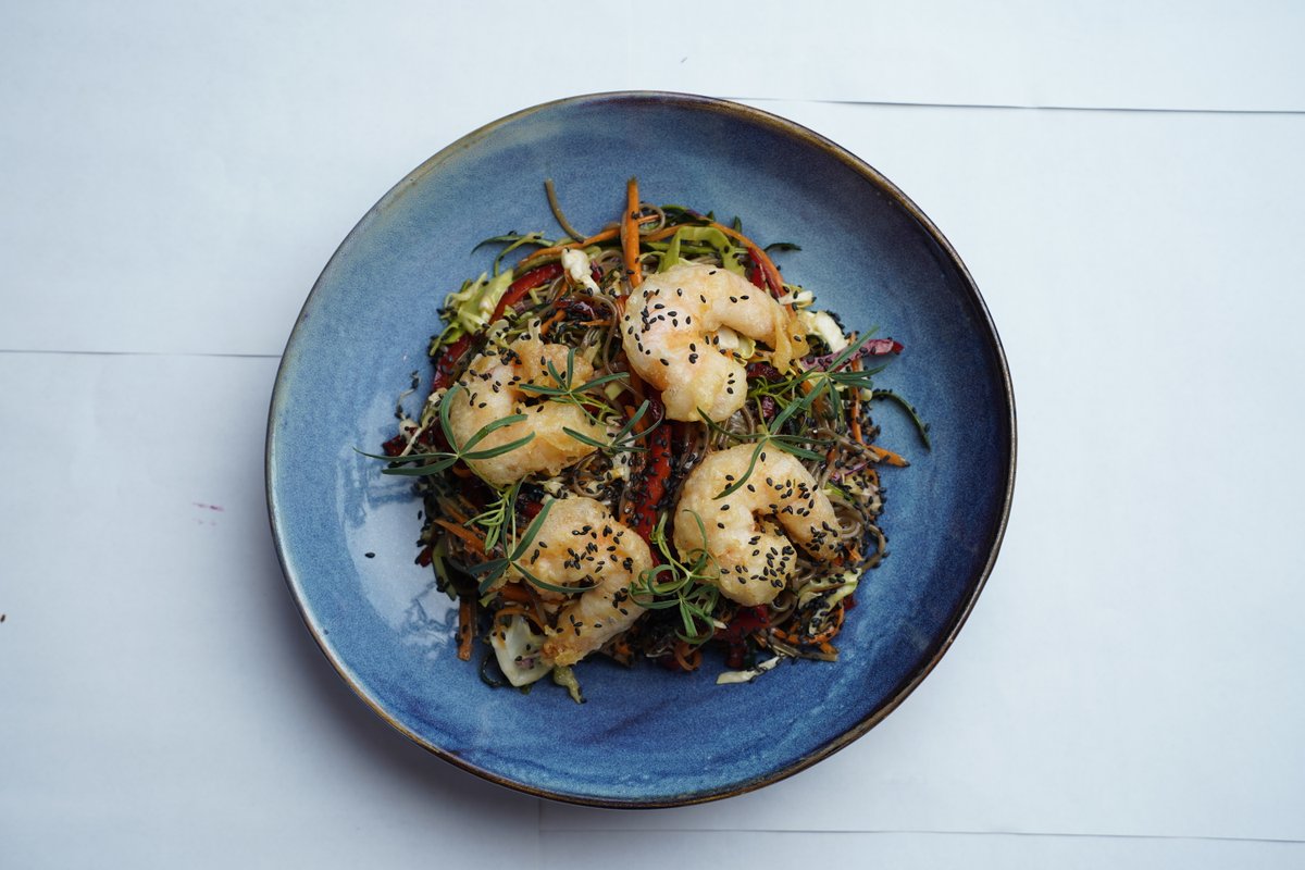egzotična salata sa hladnim soba nudlama, hrskavim povrćem i paniranim gamborima sa dresingom od susama
