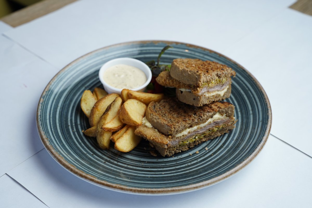 sendvič od domaćeg integralnog hleba i bečke šnicle, sa majonez sosom i trakicama kiselog krastavca i gauda sirom