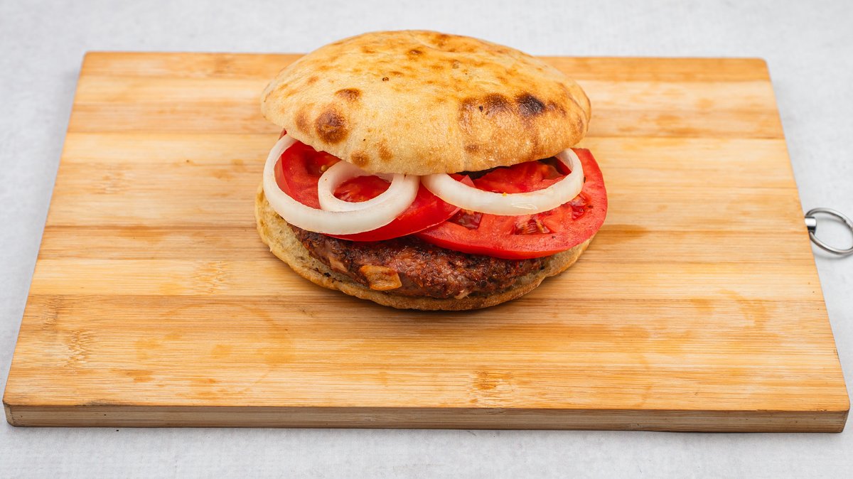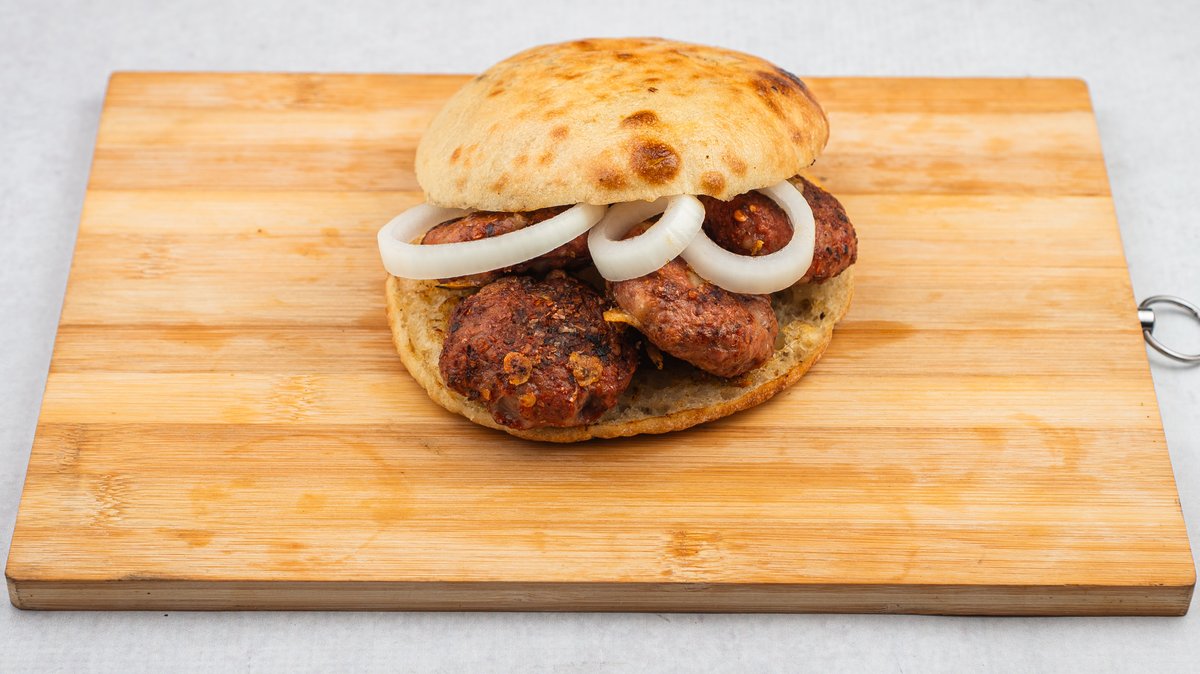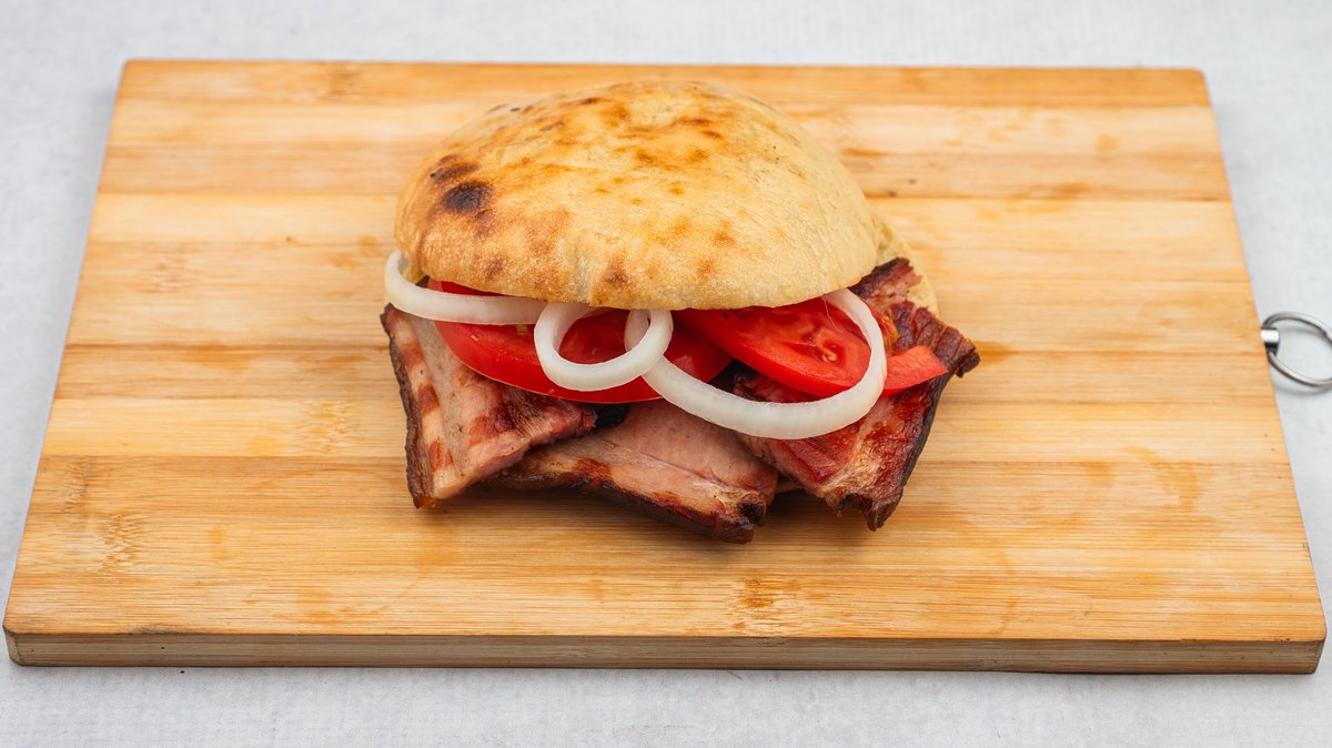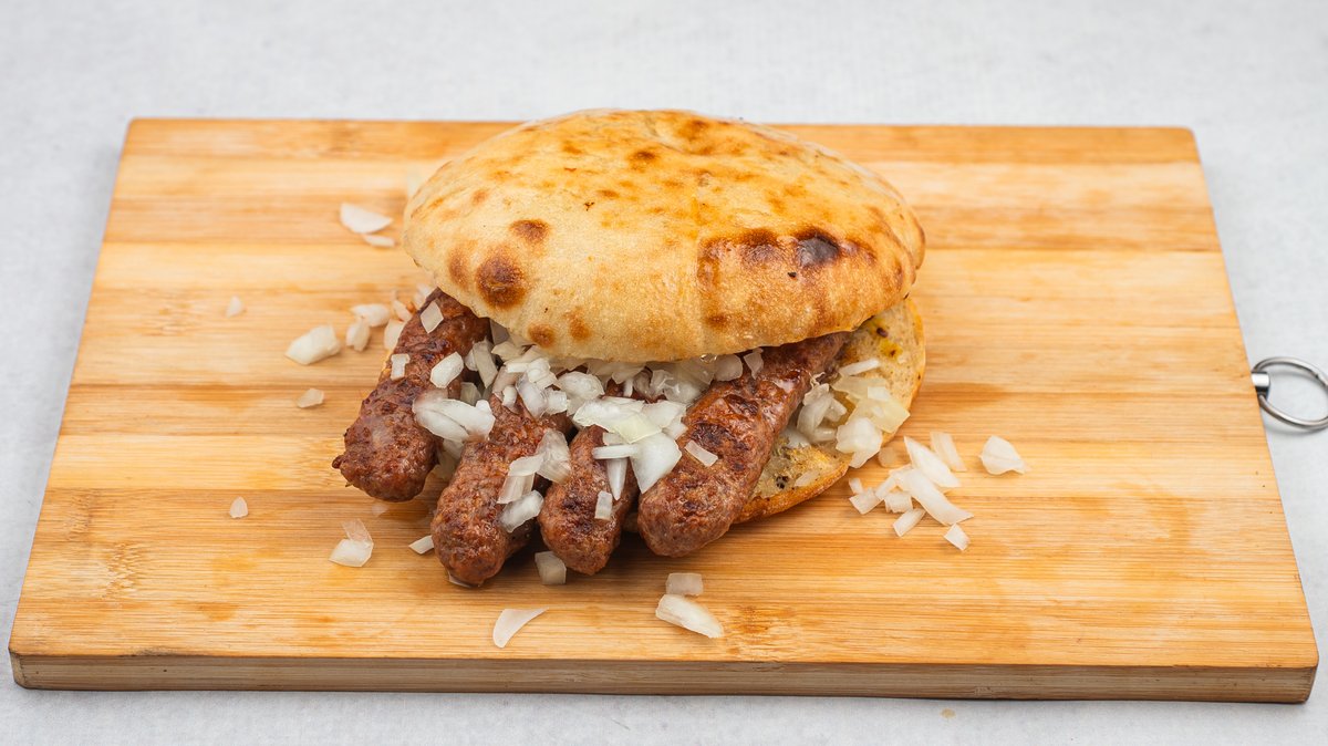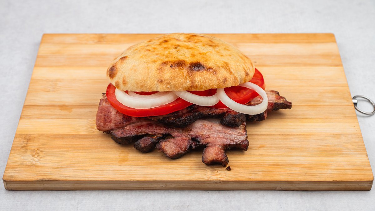Pljeskavica umešana sa kačkavaljem, domaćom dimljenom slaninicom, domaćim dimljenim suvim mesom, crnim lukom i tucanom ljutom paprikom