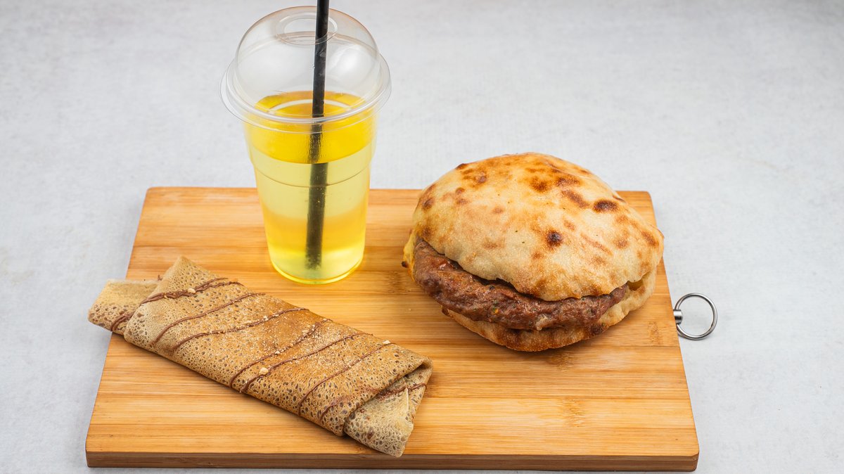 Pljeskavica punjena domaćom spržom, kačkavaljem, domaćom dimljenom slaninom i domaćim dimljenim suvim mesom