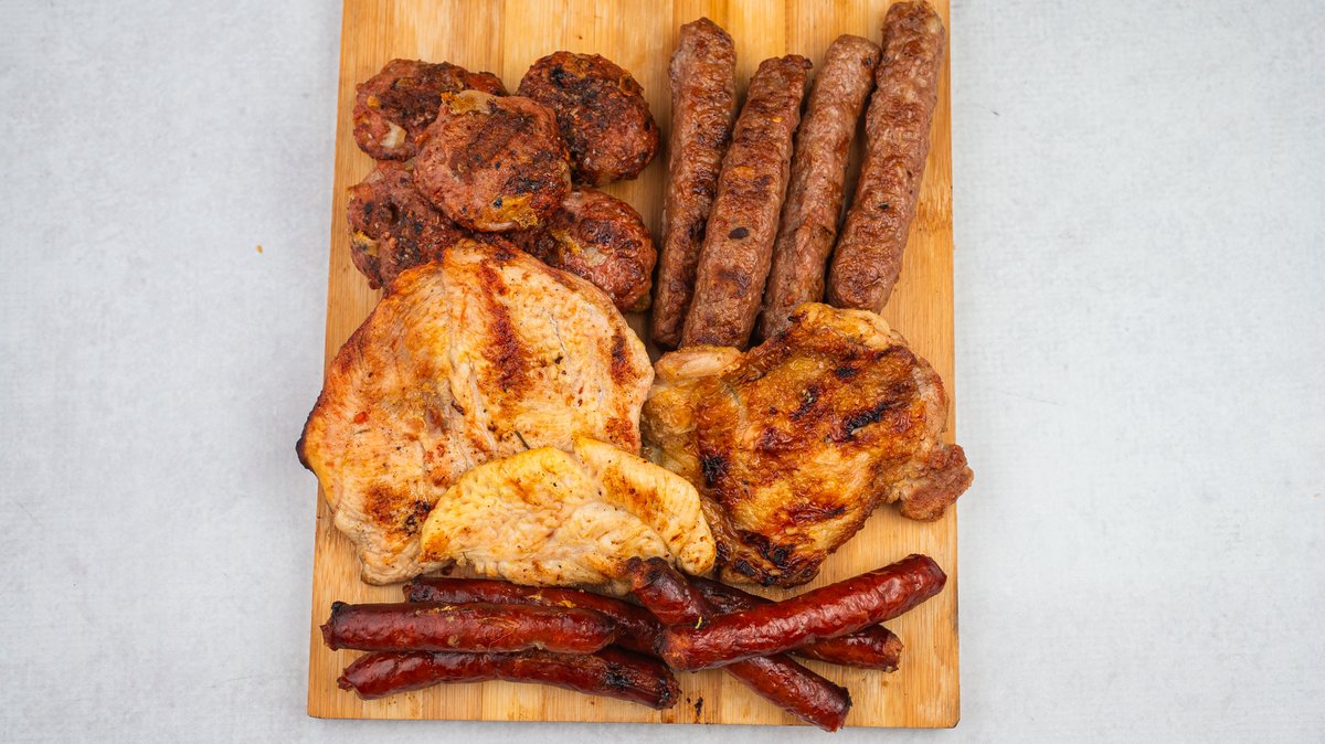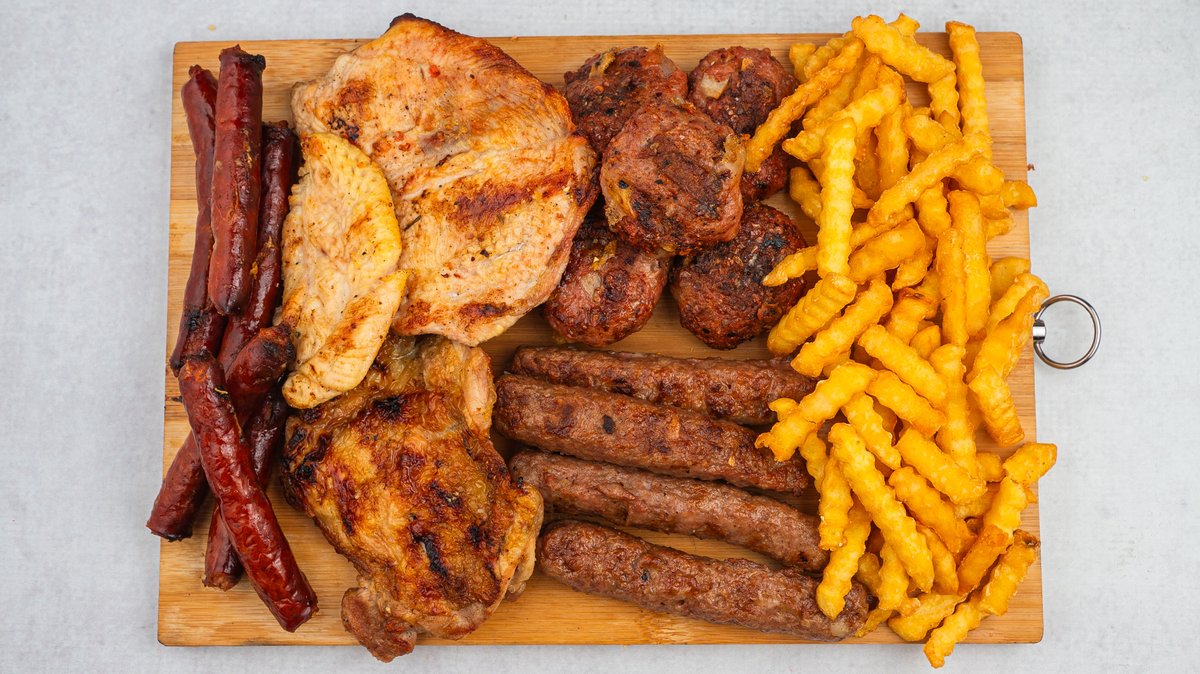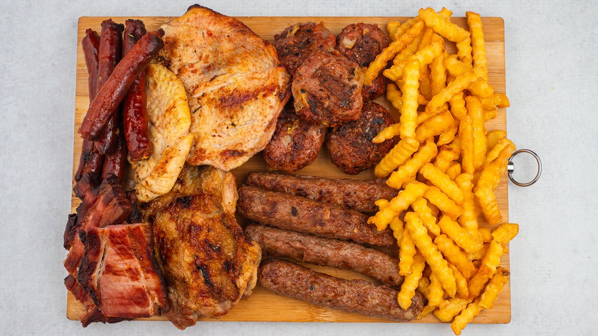 250g ćevapa, 250g uštipaka, 250g pilećeg filea, 250g pilećeg bataka, 250gr kobasica, 400g pomfrita, 4 lepinje, kupus, luk, urnebes, 1.5l Pepsi