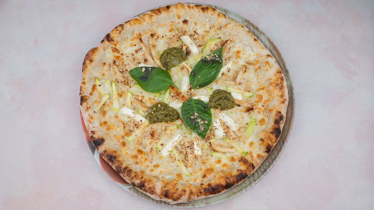 Pavlaka sos, mocarela, feta, tikvice, grilovana piletina, pesto sos, svež bosiljak, mrvljeni badem