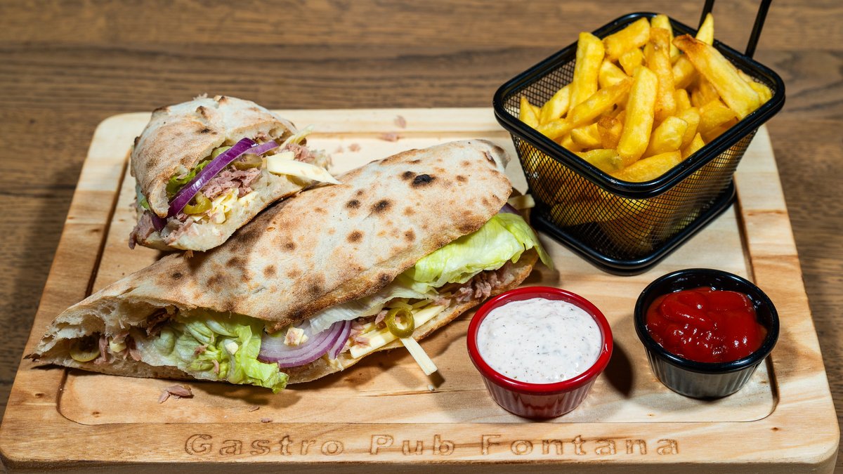 Pelat, biljni sir, sos relish, komadi tunjevine, crveni luk, masline, origano, maslinovo ulje