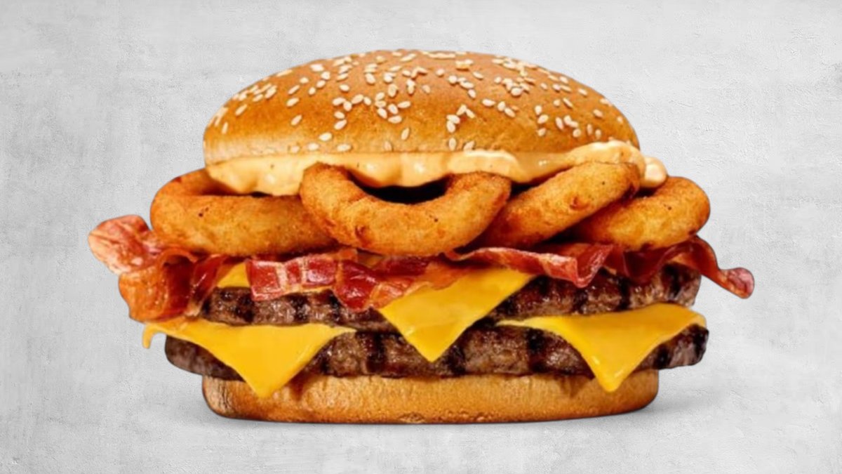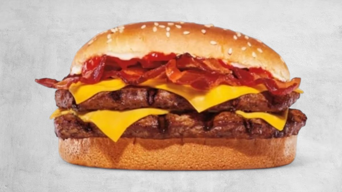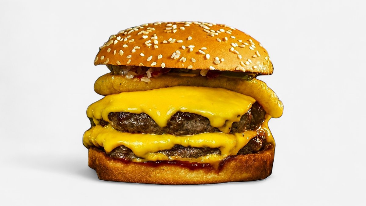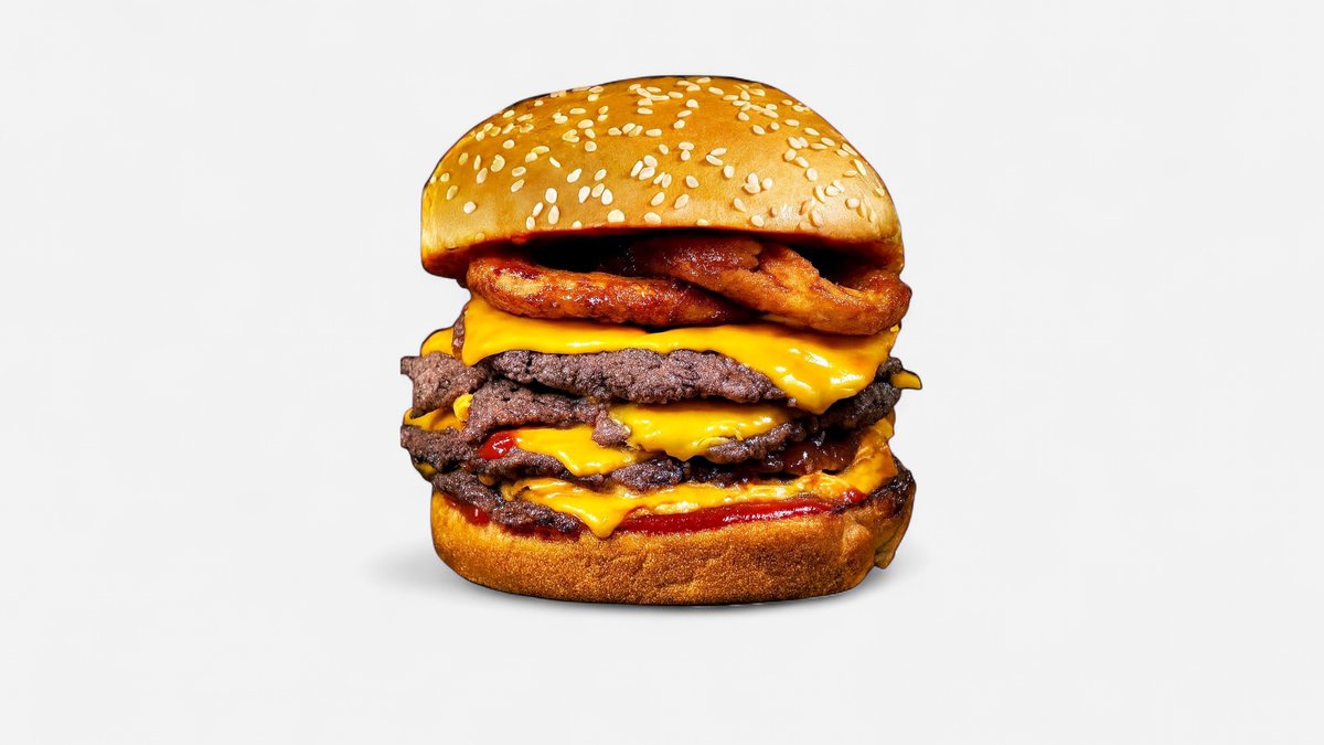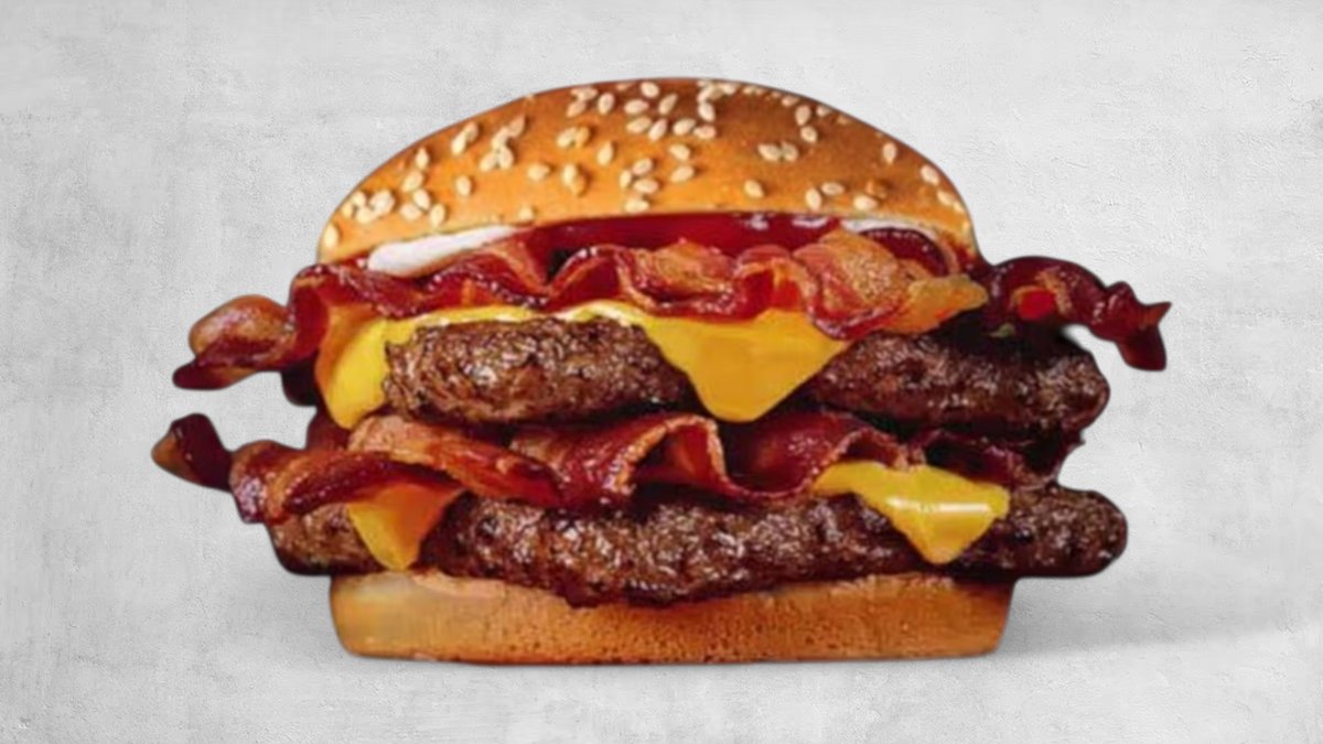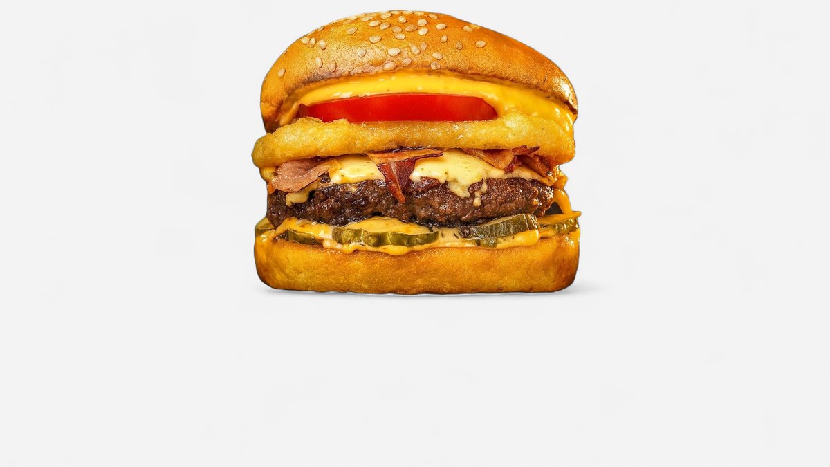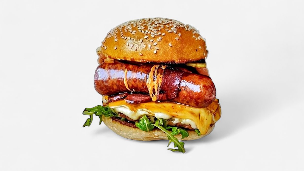 2 x juneće meso, 2 x čedar sir, kremasti majonez, bbq sos, slaninica, mekana zemička