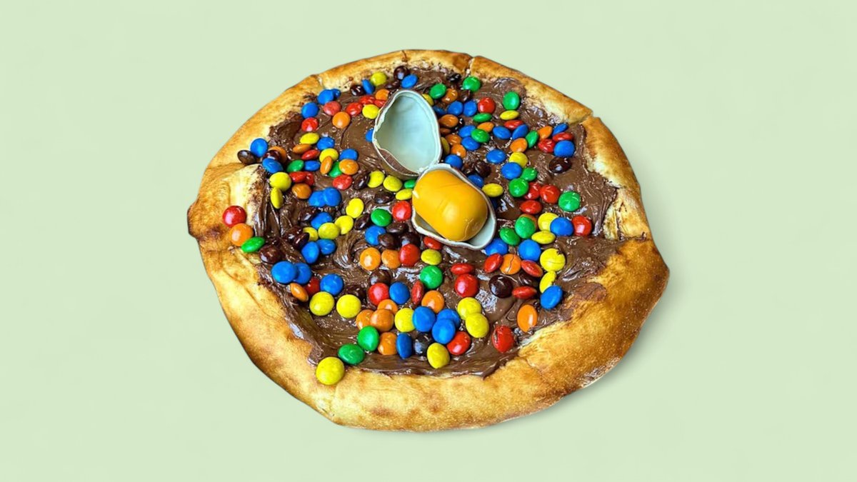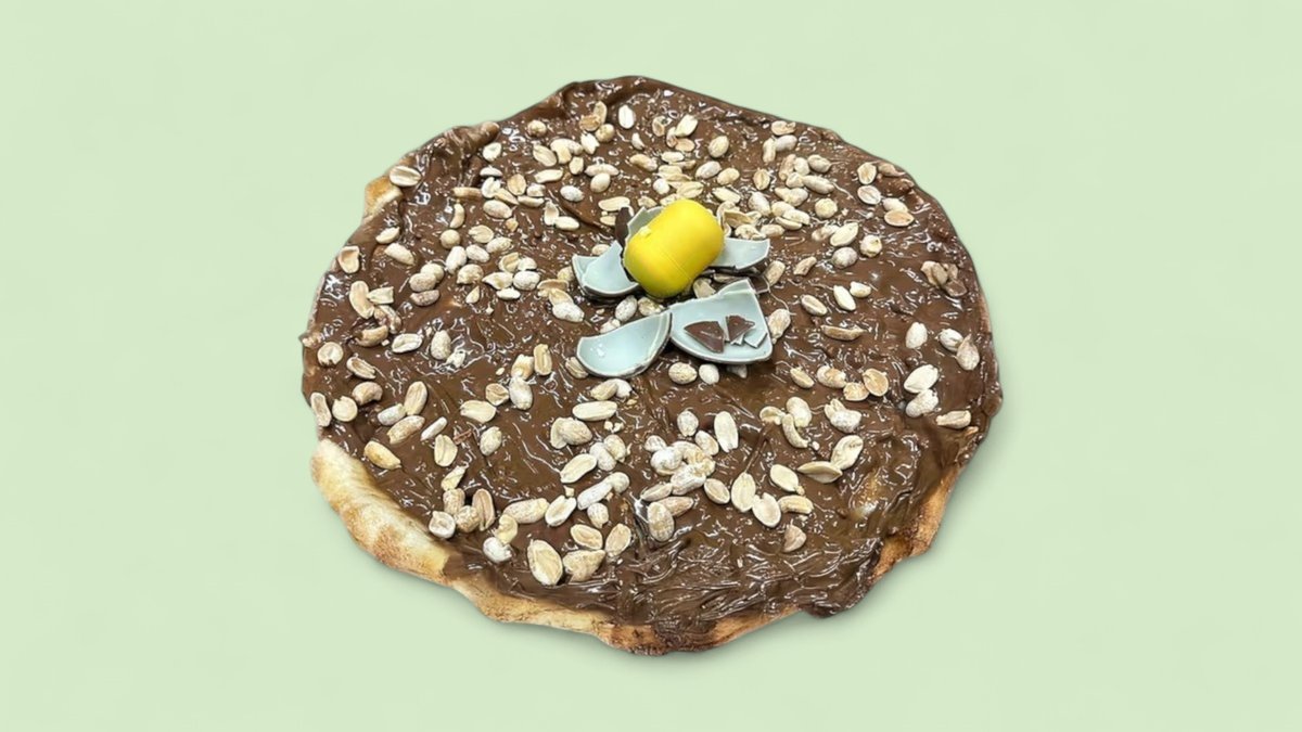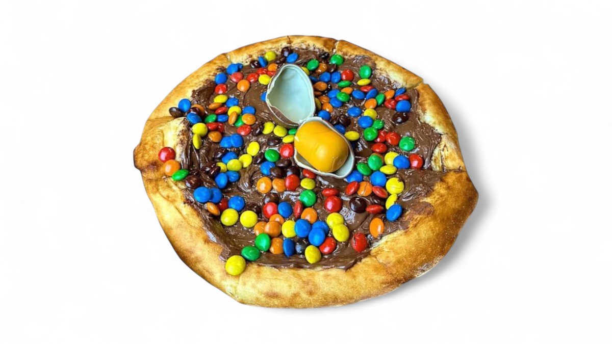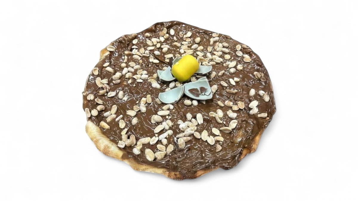 Pizza Snikersica – mekano testo preliveno kremastim Snickers namazom, obogaćeno hrskavim kikirikijem i zaokruženo slatkim iznenađenjem Kinder jajeta.🥹