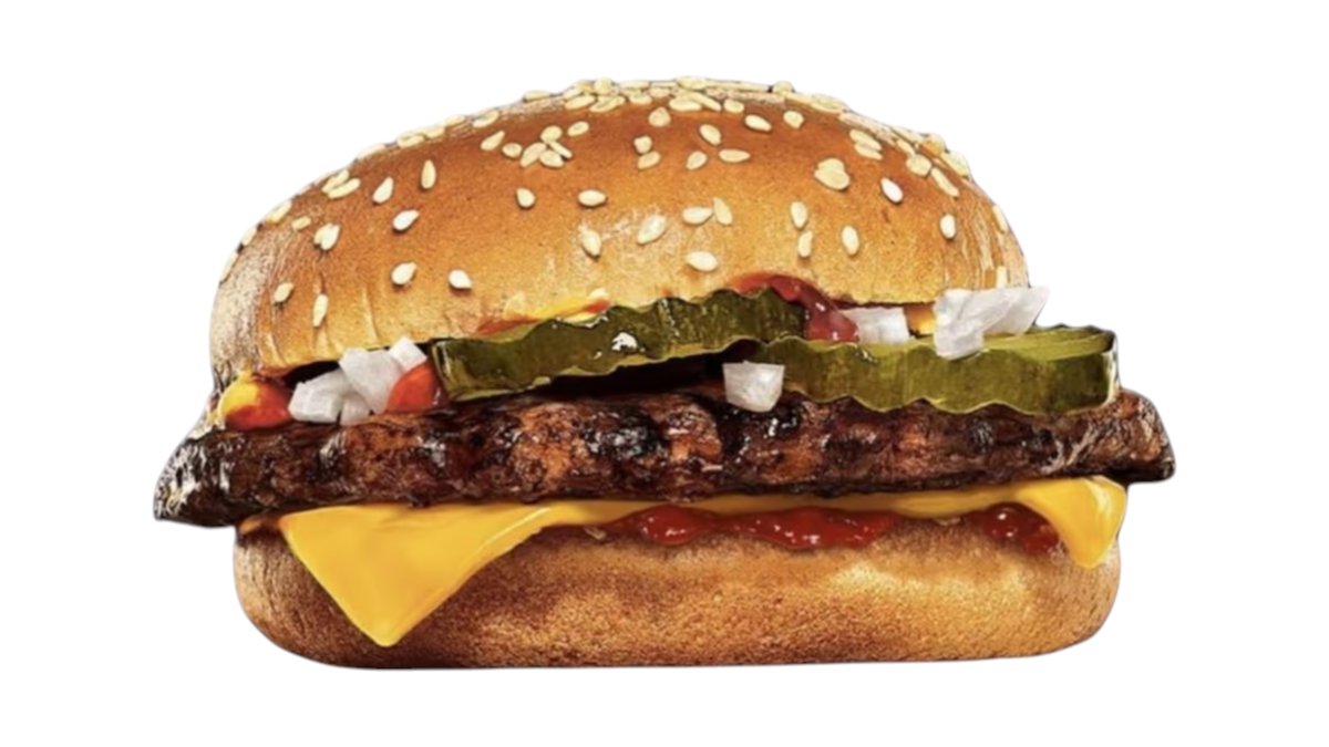Burger sa trostrukim mesom – tri puta juneće meso, tri sloja cheddar sira, crveni sos i senf, uz hrskavu slaninicu, crveni luk i krastavčiće.