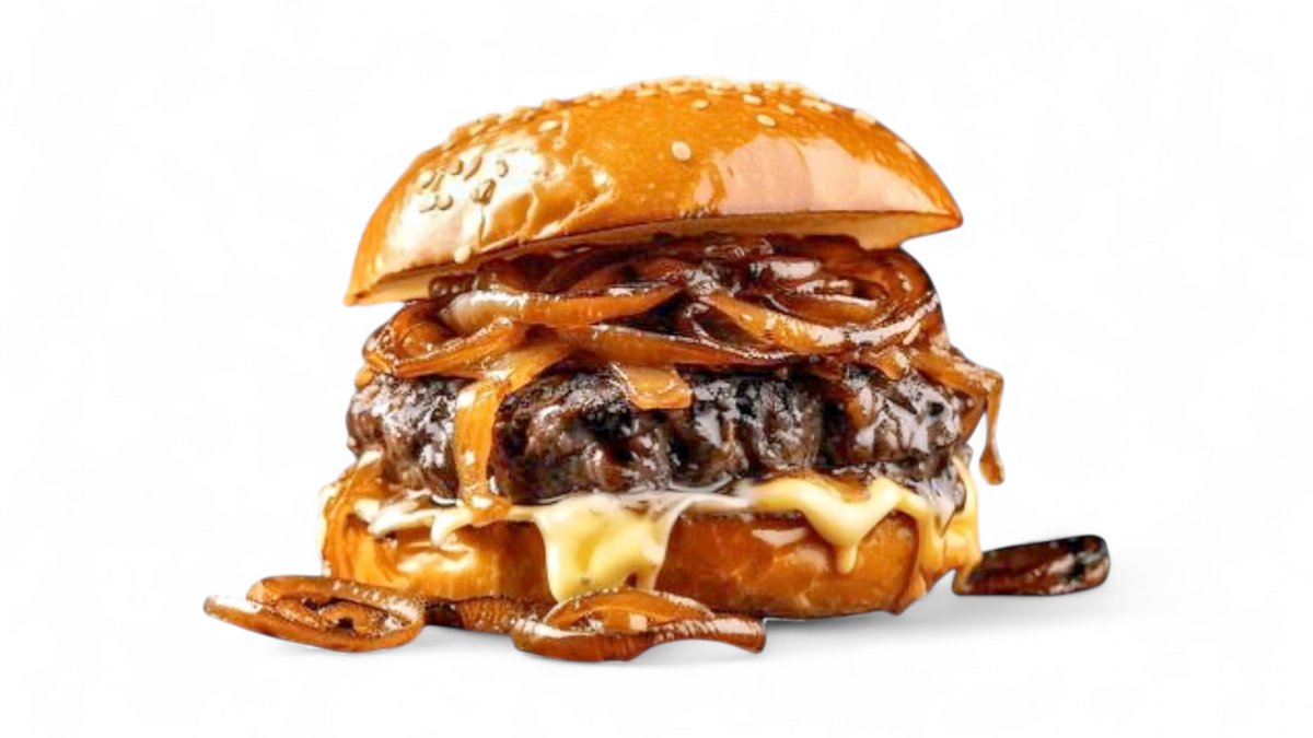 Burger sa duplim junećim mesom – dva puta sočno juneće meso, tri sloja topljenog cheddar sira, BBQ i crveni sos za savršen spoj ukusa. Dva hrskava onion ringa daju posebnu notu, sve u mekanoj zemički