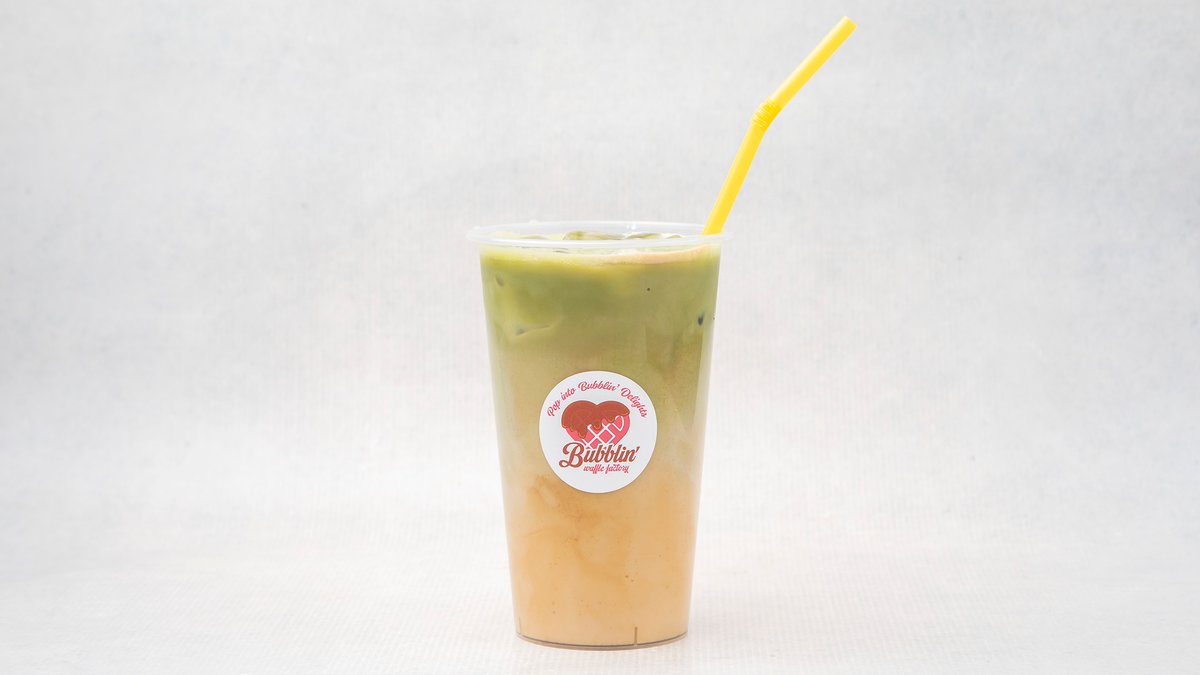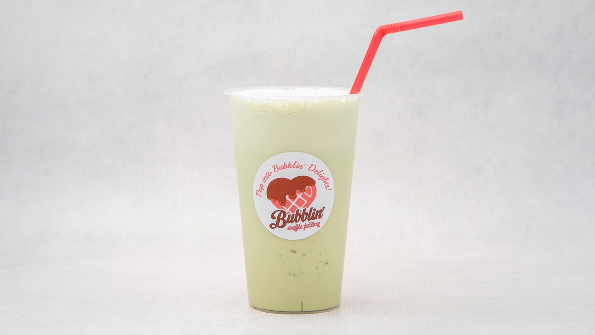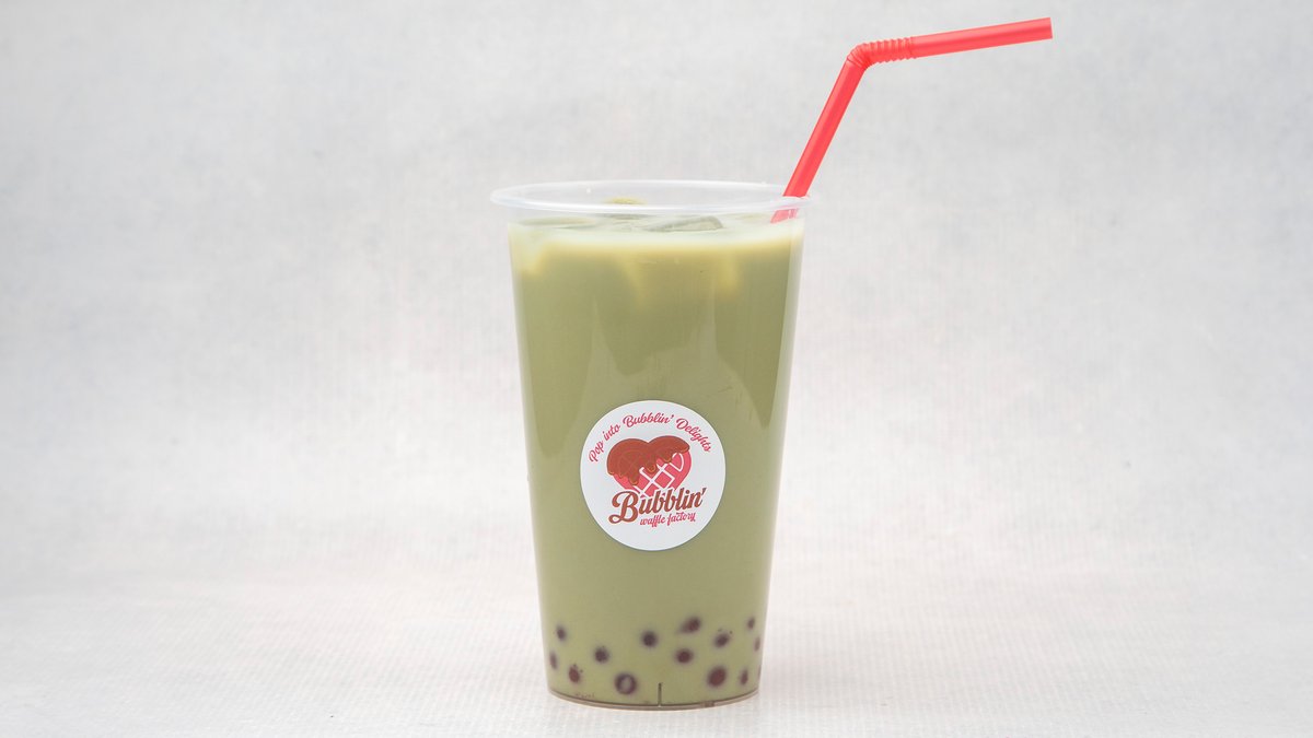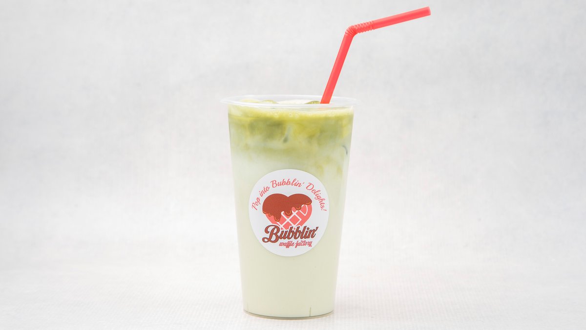 Ceremonial grade matcha with milk and ice, mixed in blender
