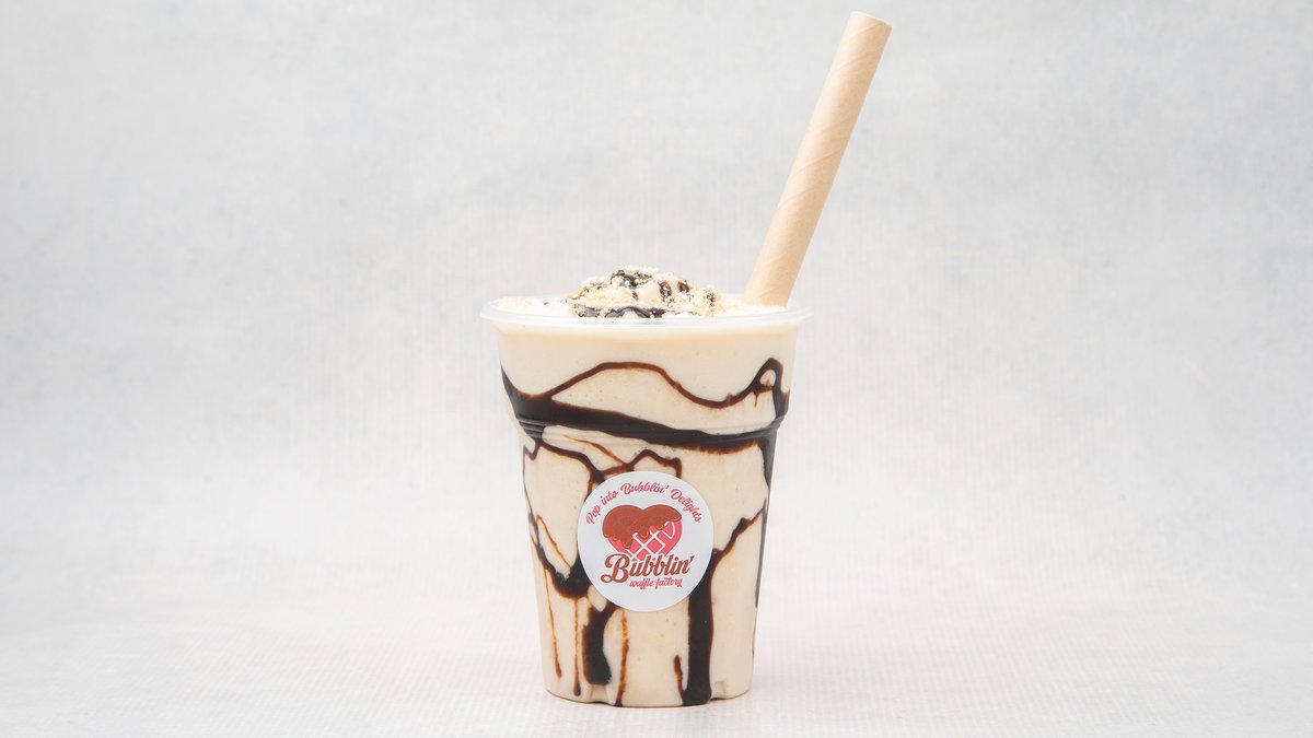Milk, oreo powder, scoop of vanilla ice cream, ice