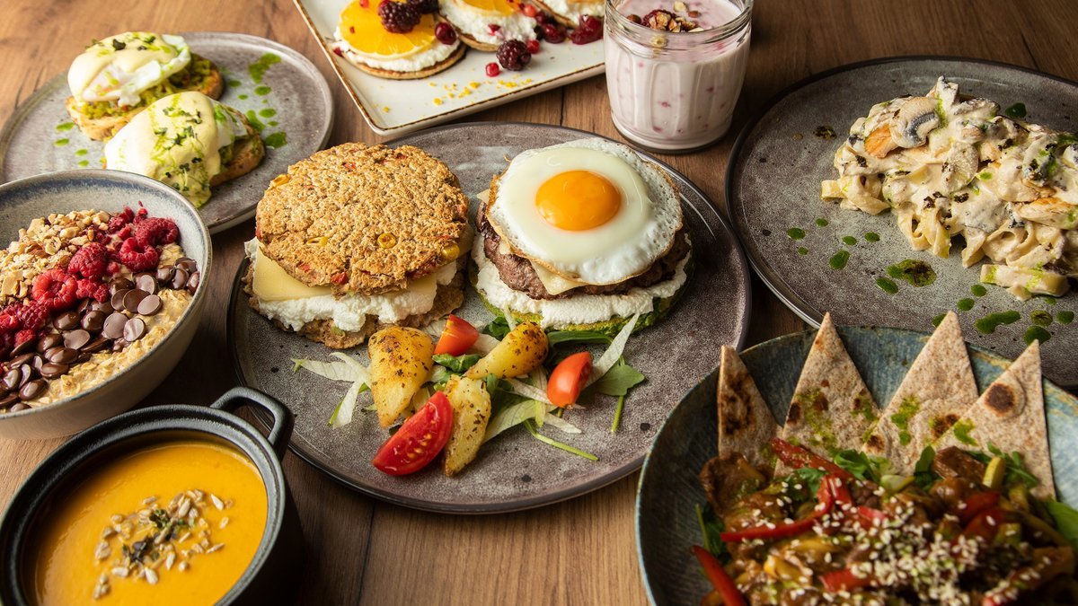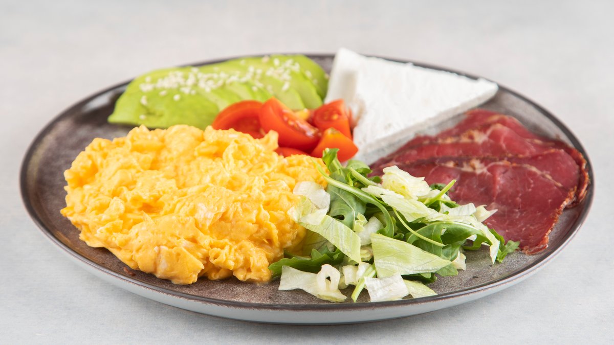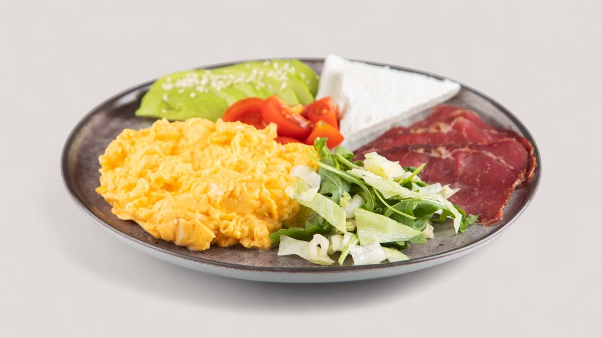Kajgana 5 jaja, avokado, goveđa pršuta, feta sir, cherry, susam P:60g UH:10g M:45g , 685kCal