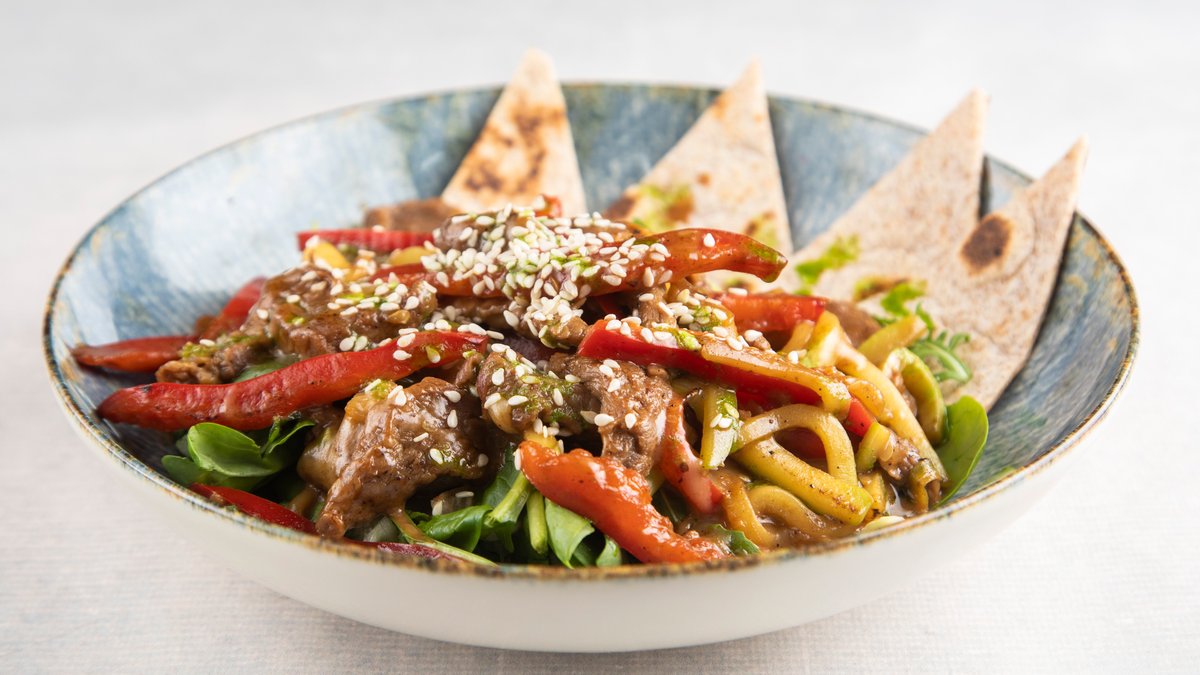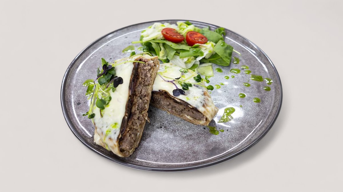 Mlevena junetina 200g, goveđa pršuta, crveni luk, mozzarella, integralna tortilja, urda sir P:71g , UH:36g , M:35g , 743kCal
