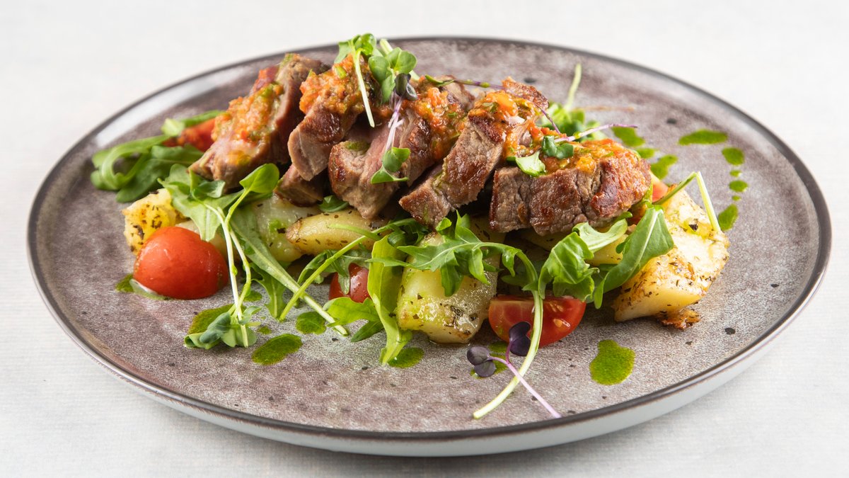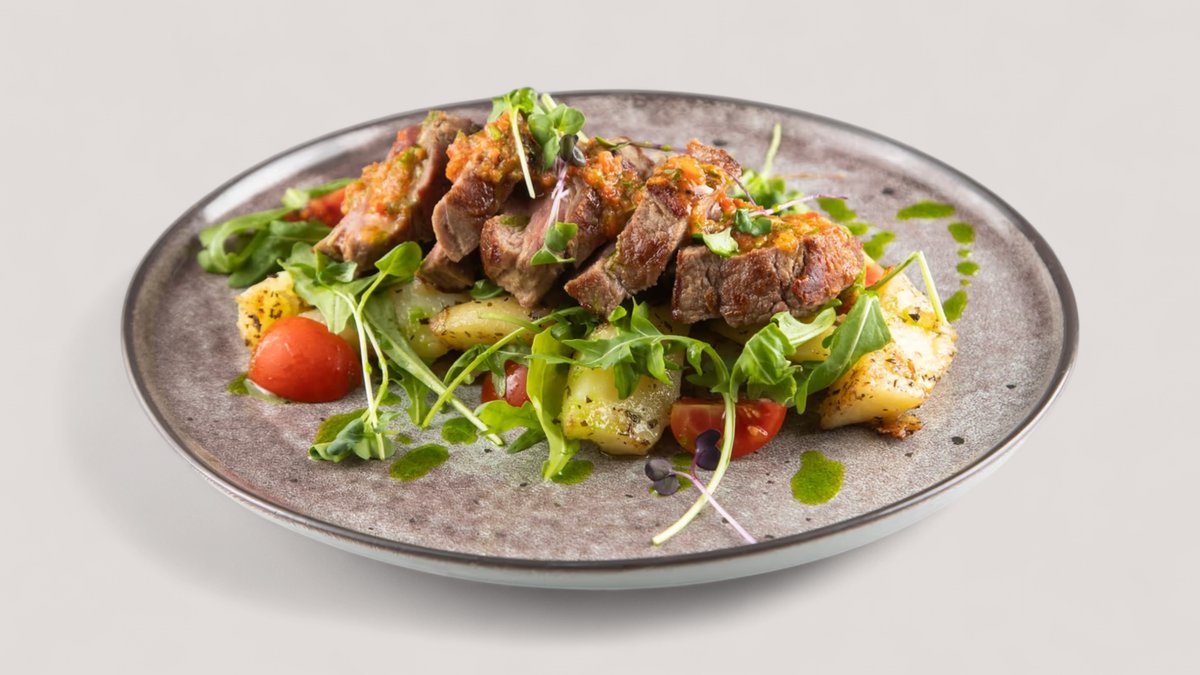 Biftek, krompir, chimichuri, rukola, cherry P:64g , Uh: 39g, M:21g , 601 kCal