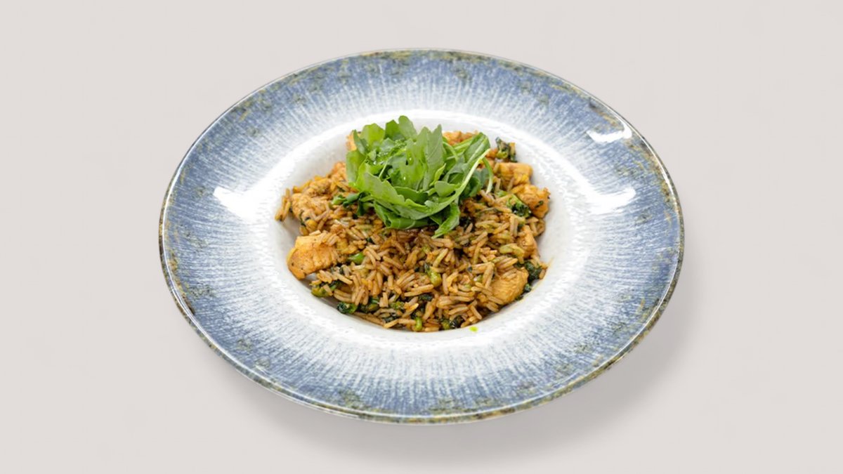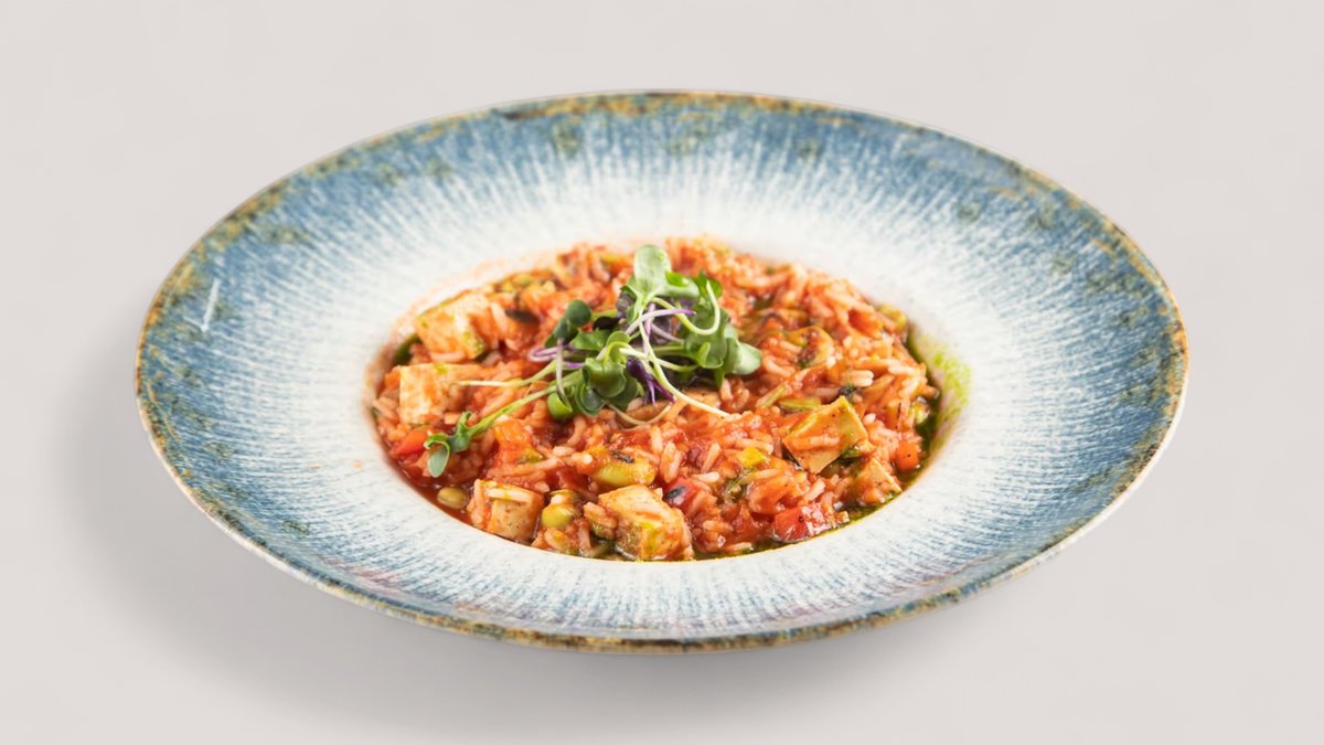 Tikvice, pečurke, paprika, edamame, paradajz pelat, basmati pirinač P:22g , UH:66g , M:8g , 424kCal