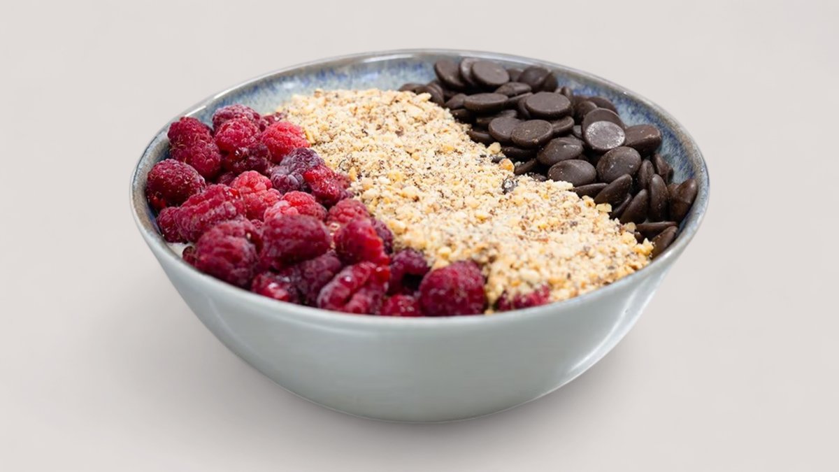 Malina, grčki jogurt, protein vanila, med, lešnik P:20g , Uh:30g , M:12g , 306kCal