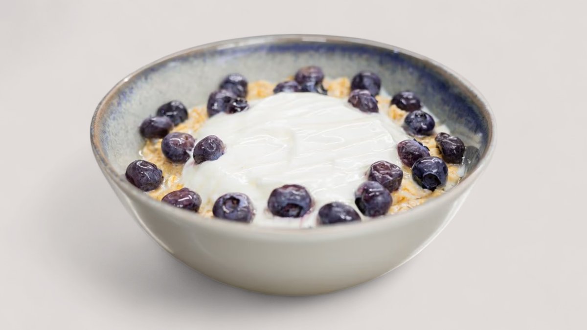 Ovsene pahuljice, mleko, banana, protein vanila, med, grčki jogurt, borovnica
