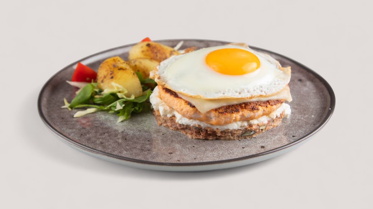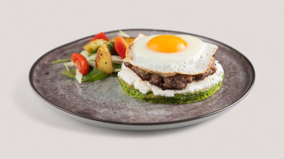3 cela jaja, 1 belance, pančeta, baby spanać, mozzarela, urda sir P:50g , UH:4g , M:48g , 648kCal
