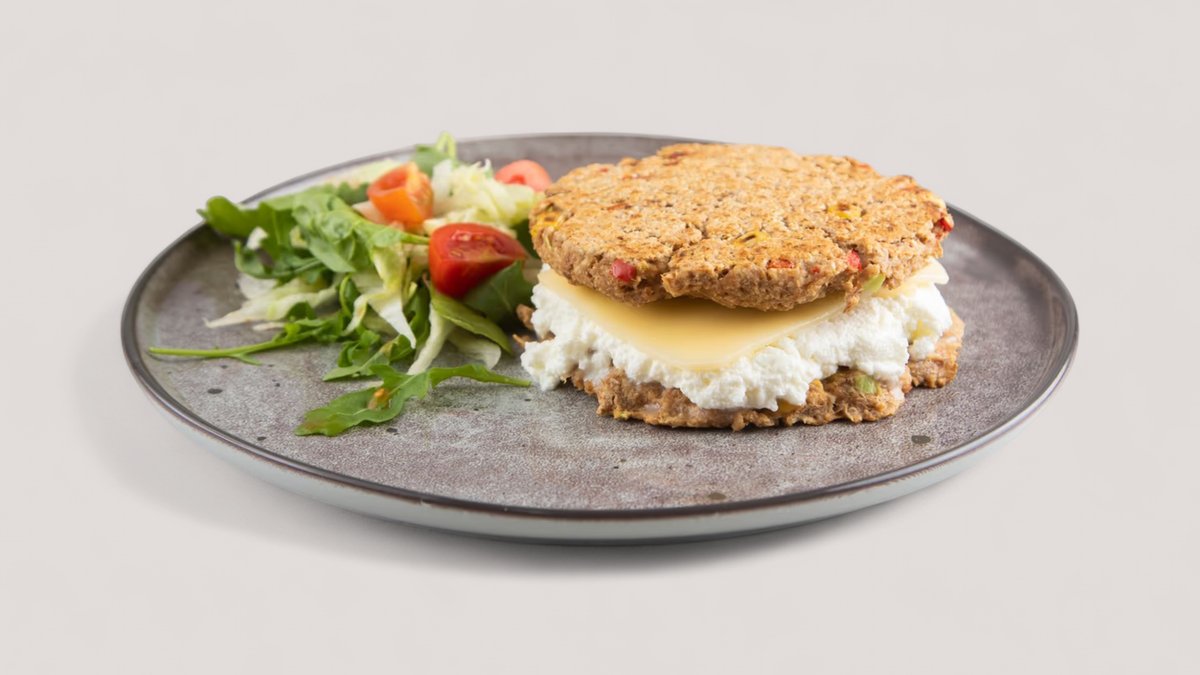 Tunjevina 120g, jaja, ovsene pahuljice, kukuruz šecerac, crvena paprika , urda sir, mozzarella, baby spanac, cherry P:78g , UH: 45g , M:35g , 807kCal