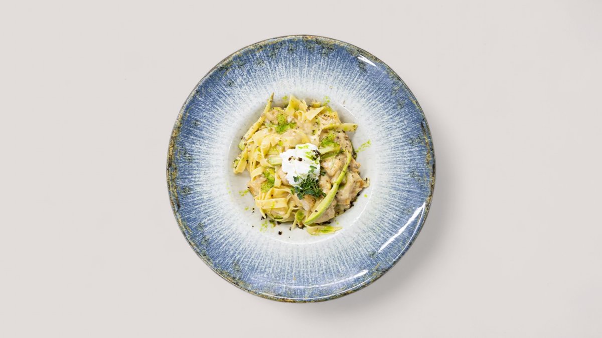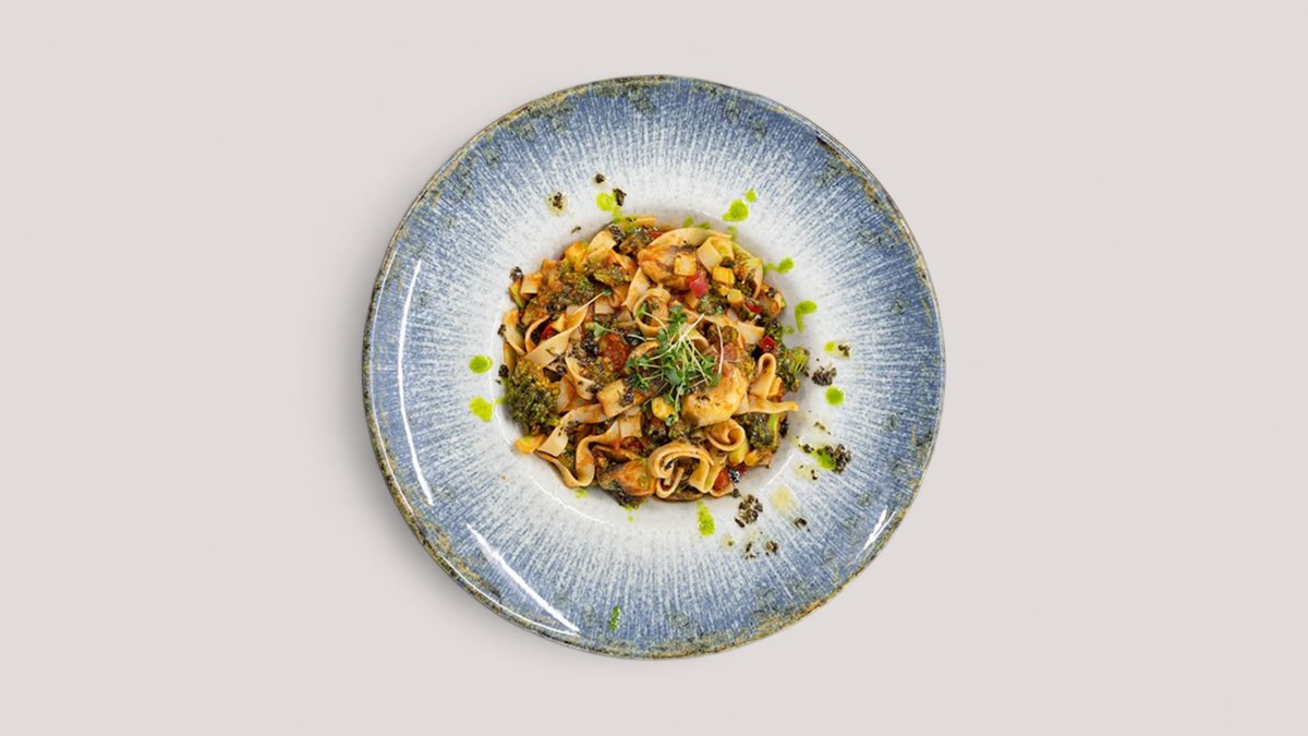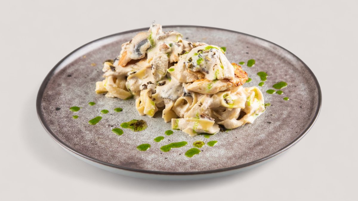 Pileći file, miks šumskih pečuraka, urda sir, mozzarella, , soja sos, taljatele P:73g , Uh: 56g , M:21g , 705 kCal