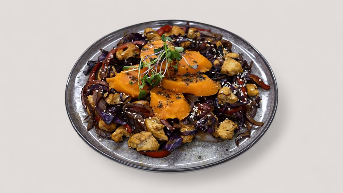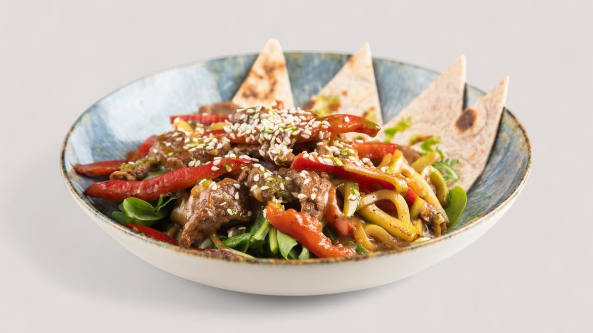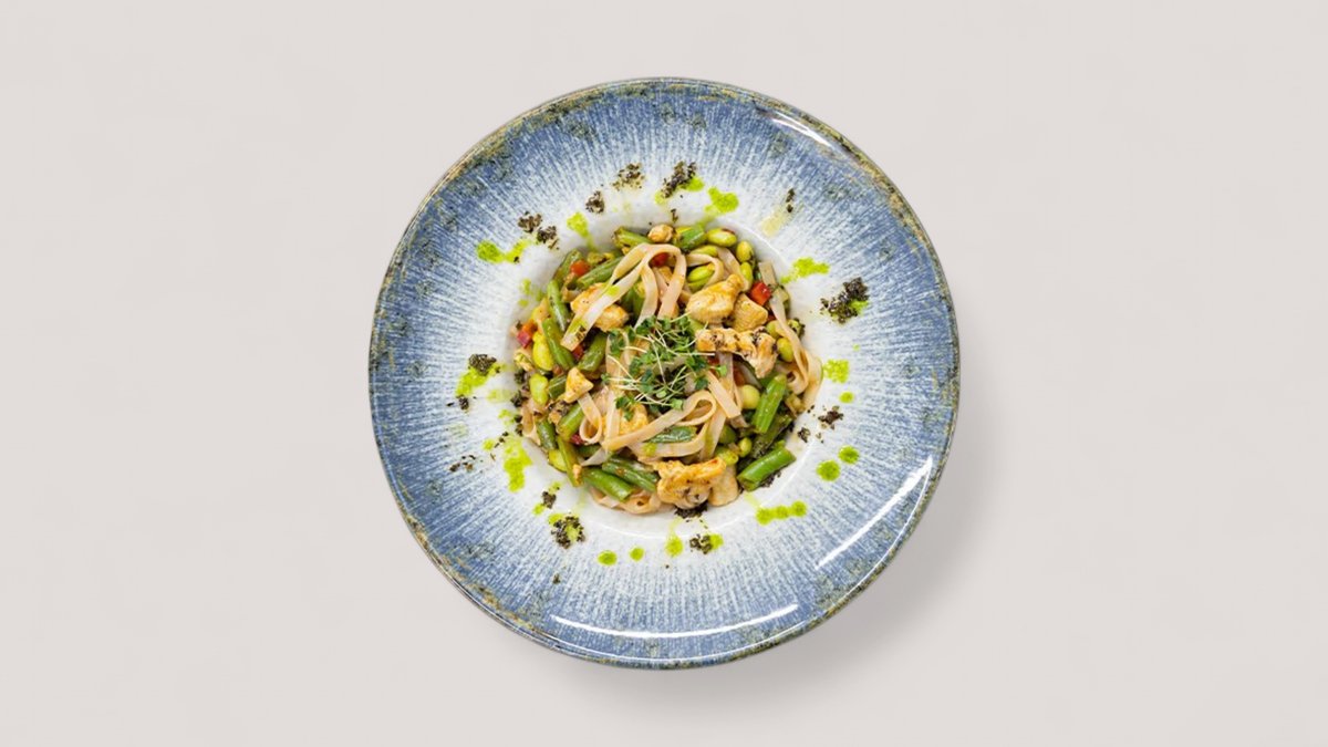 Pileći file, pirinčane nudle, edamame, paprika, zelena boranija, praziluk, sweet chili P:45g , UH:73g , M:9g , 553kCal