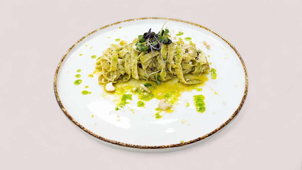 Homemade pesto sos, taljatele, parmezan, indijski orah , feta sir P:25g , UH: 65g , M:38g , 702 kCal