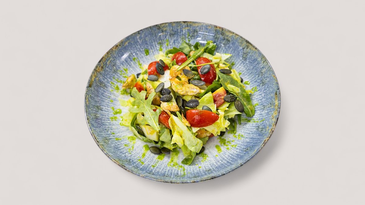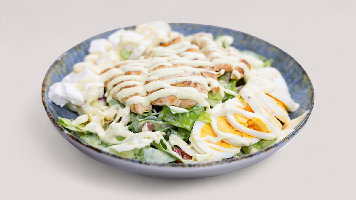 Pileći file, zelena salata, rukola, iceberg, jaje, feta, krastavac, cherry, francuski dresing P:52g, Uh:10g, M:24g, 464kCal