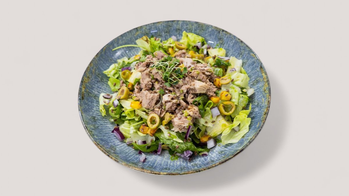 Tunjevina 120g, zelena salata, iceberg, rukola, kukuruz sećerac, crveni luk, lan, zelena maslina P:42g, Uh:14g, M:24g, 440kCal