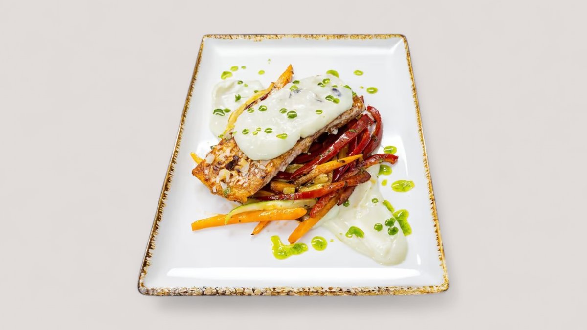 Losos file, badem listići, tikvica, paprika, šargarepa, avokado, grčki jogurt P:40g , Uh: 20g , M: 35g , 555kCal