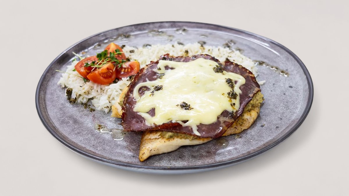 Ćureći file, govedja pršuta, mozzarella, namaz od tikvica, basmati pirinač P:70g Uh:80g M:18g 762 kCal