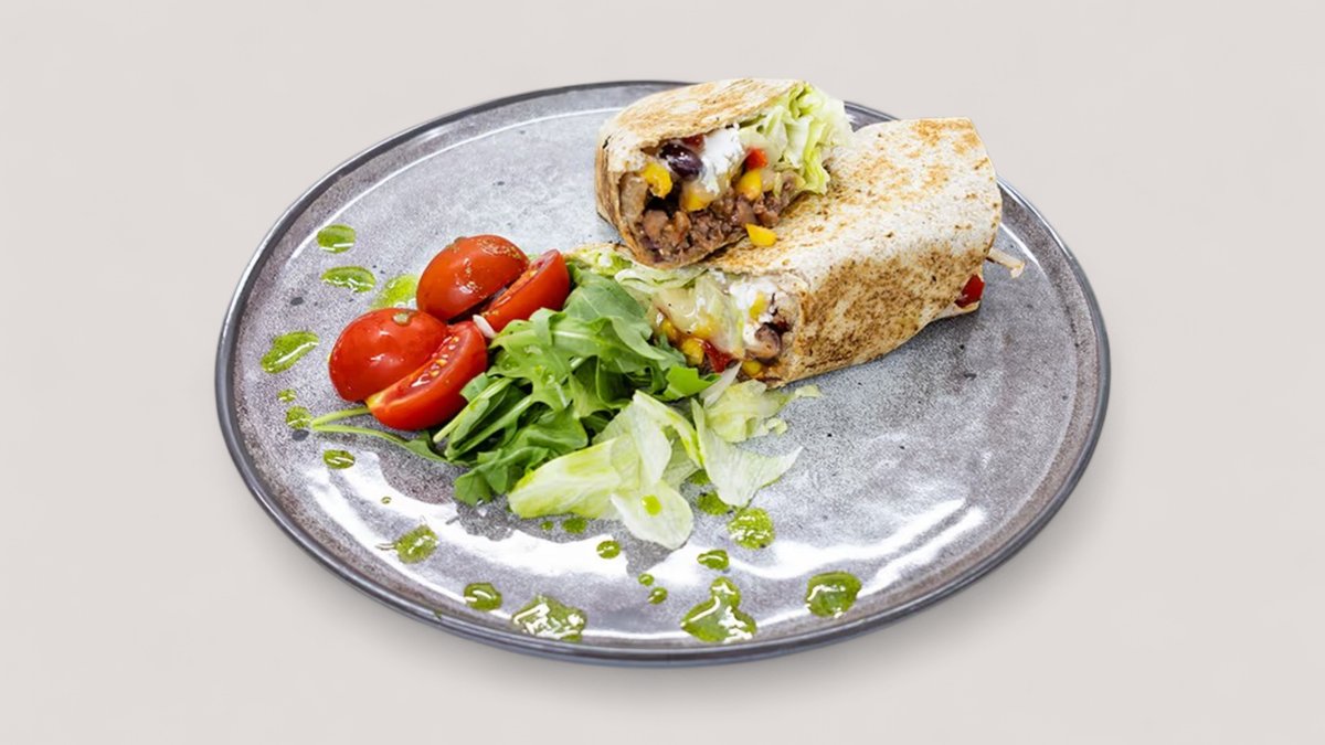 Mlevena junetina, integralna tortilja, urda sir, iceberg, kukuruz šecerac, crveni pasulj, mozzarella,paprika P:50g , Uh:50g , M:20g 580kCal