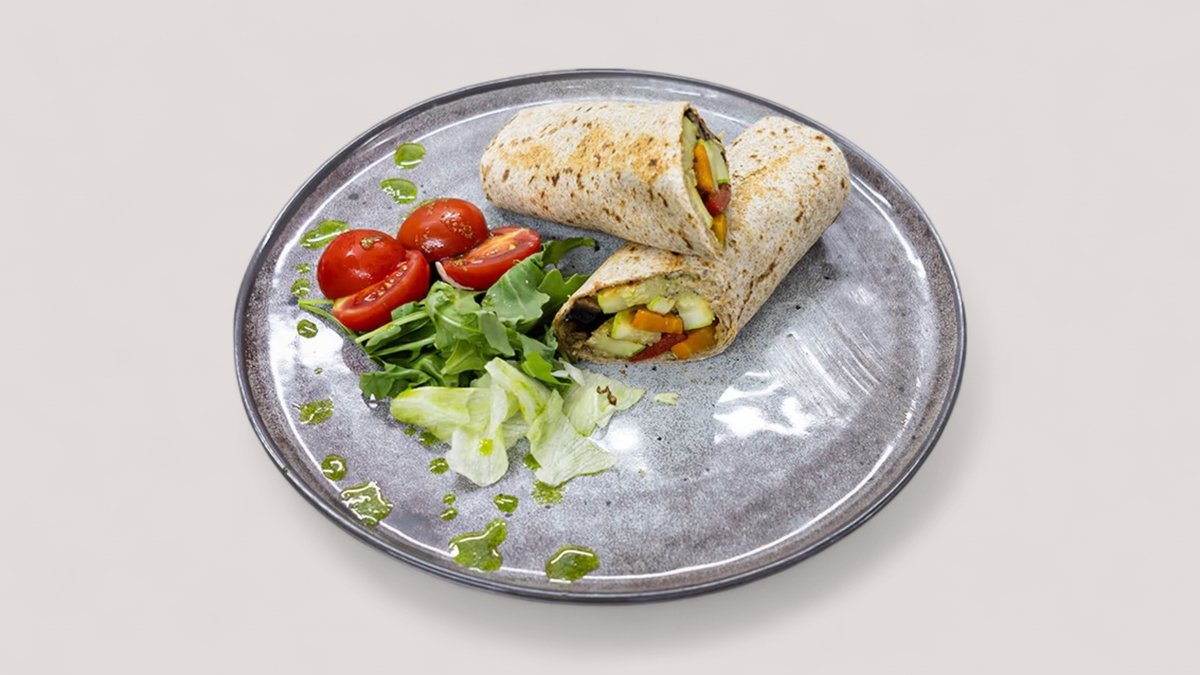 Integralna tortilja, namaz od tikvica, tikvica, paprika, sargarepa, pecurke , tofu sir P:11g , Uh: 38g , M:7g , 259 kCal