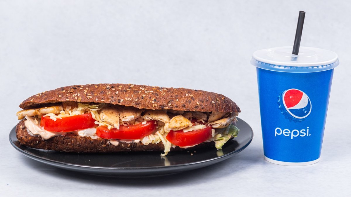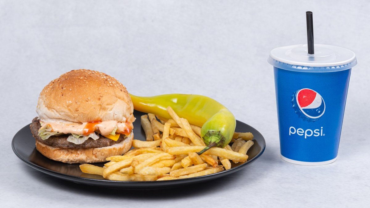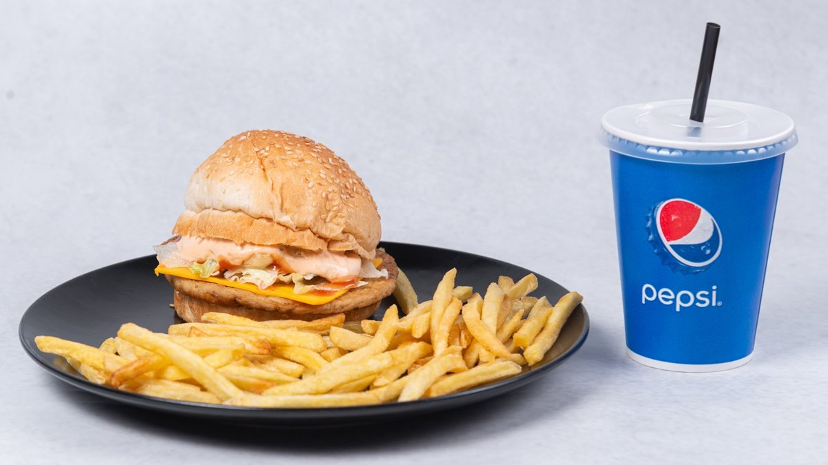 Burger, pomfrit i piće. Zemička sa susamom, govedina 90g, pileće meso, burger sos, kečap, zelena salata, topljeni sir
