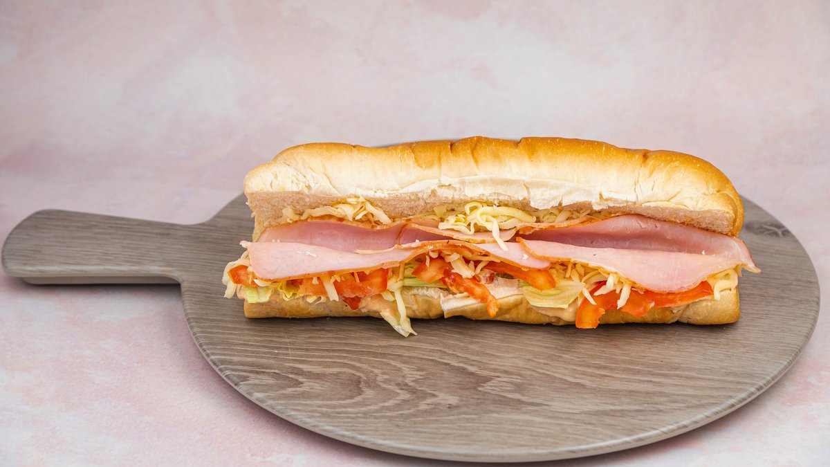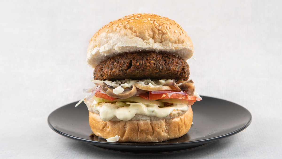Zemička susam, tri vrste kačkavalja, marinirane pečurke, krem sos od belog luka, krastavac, paradajz, crveni luk, tartar sos, iceberg salata