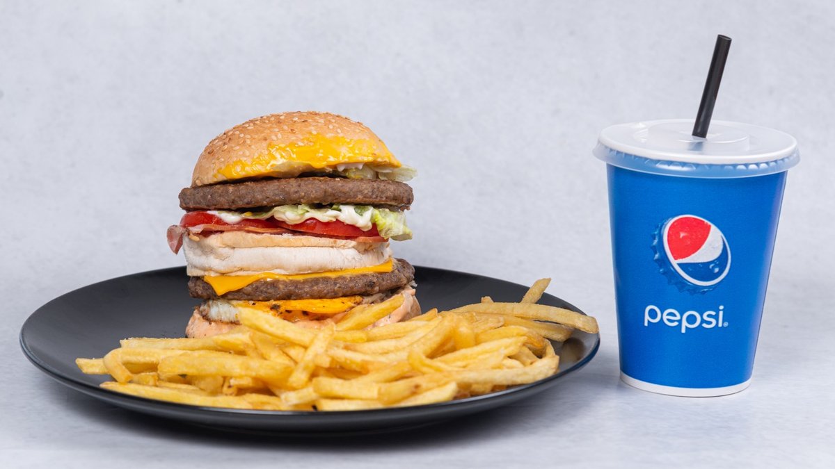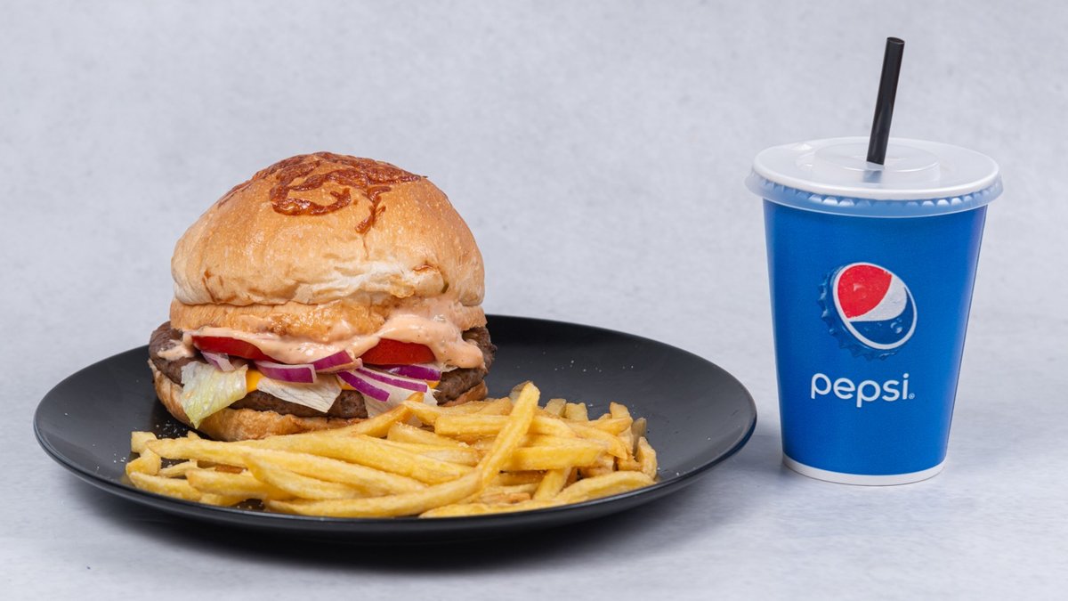 Burger, pomfriet i sok po izboru. Zemičkq bez susama, dupla hrskava slaninica, čedar sir, dehidrirani crni luk, snack sir, kiseli krastavčići, kečap, burger sos, senf, govedina 2x50g