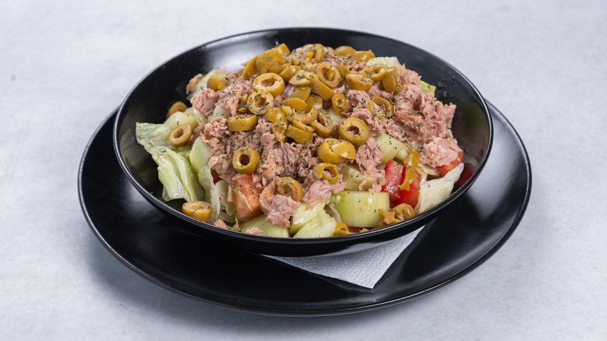 Krastavac, zelena salata, paradajz, masline, komadi tune, origano