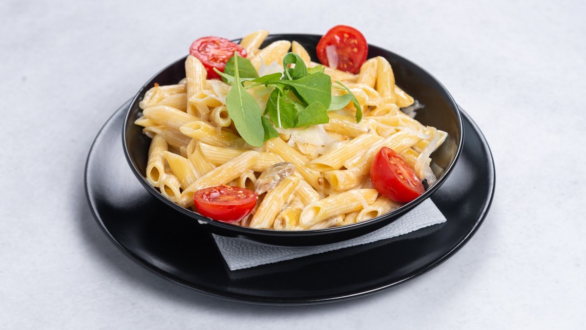 Tri vrste pečuraka, senf, beli luk, beli vino, neutralna pavlaka, čeri paradajz i parmezan