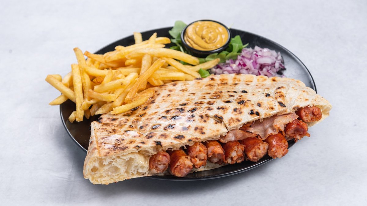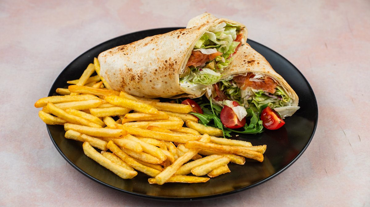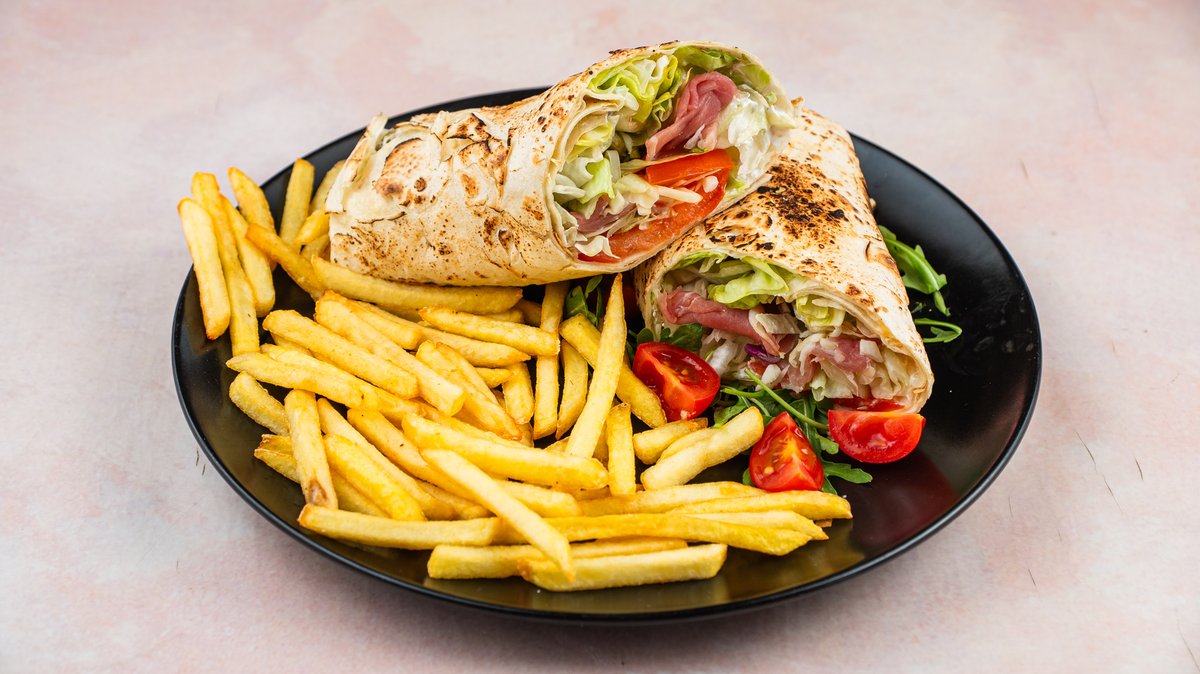 tortilja, kisela pavlaka, iceberg salata, paradajz, ljubičasti luk, rendandi sir, kiseli krastavci, pršuta, pomfrit