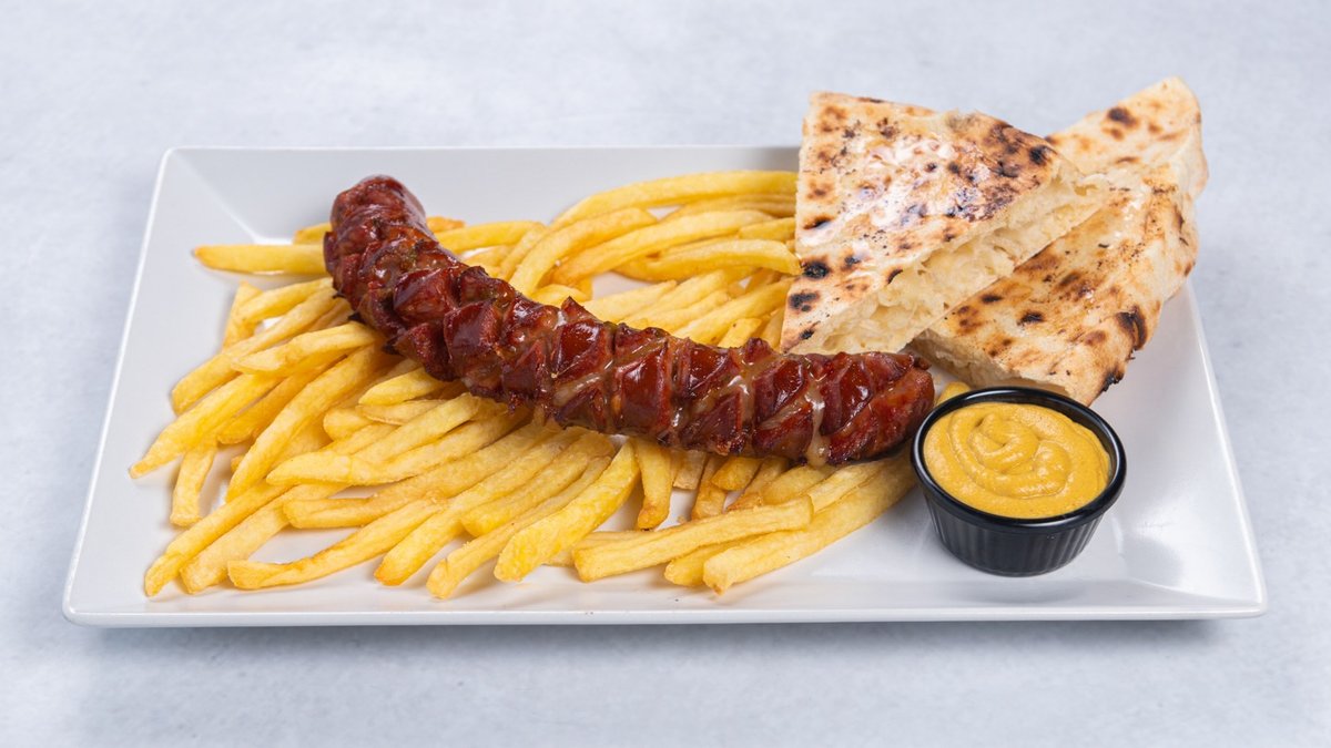 ćevapčići 20 kom., pržena paprika, kajmak, vedžis krompir, rukola, čeri paradajz, ljuta paprika