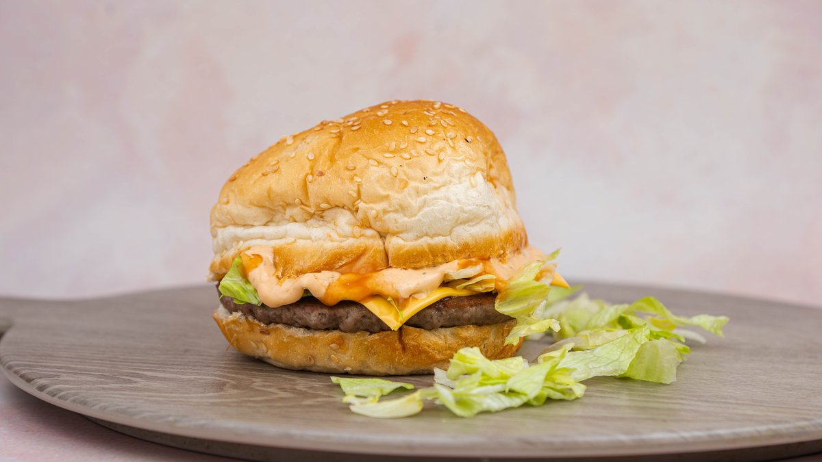 Zemička sa susamom, govedina 90g, burger sos, kečap, zelena salata, topljeni sir
