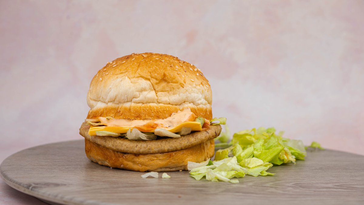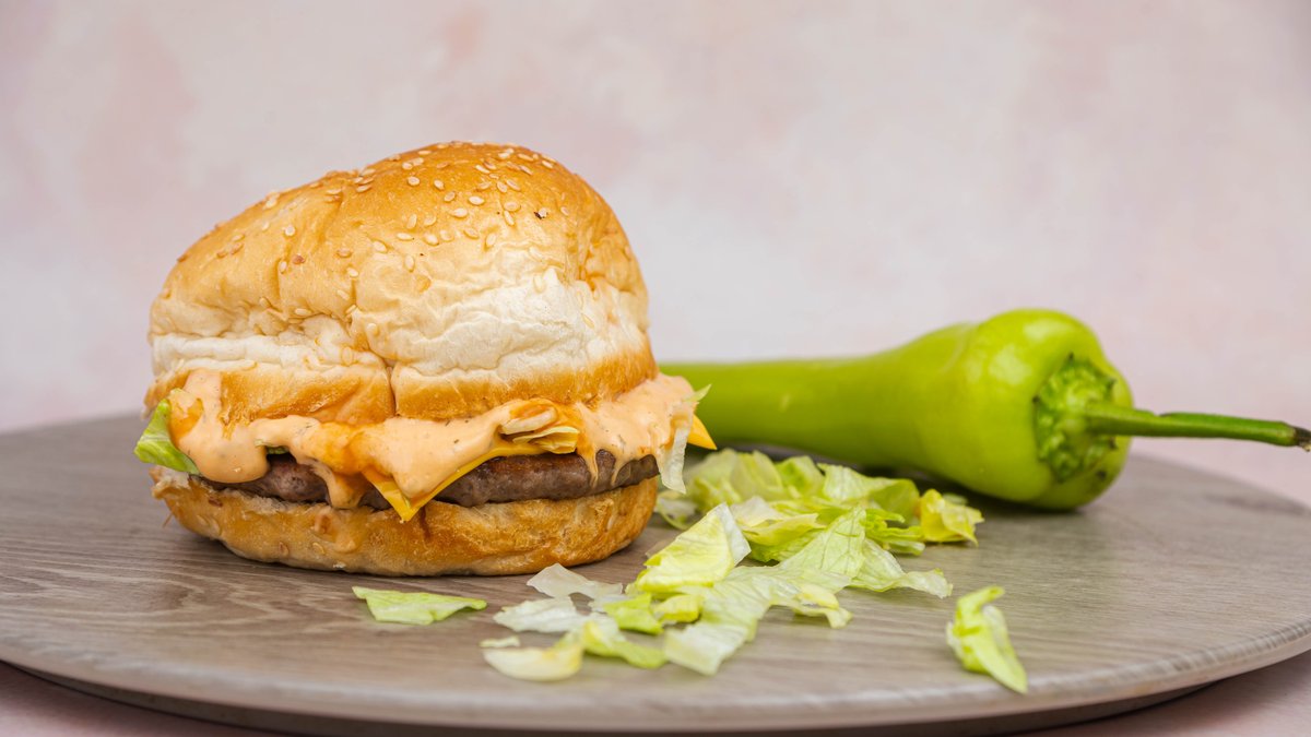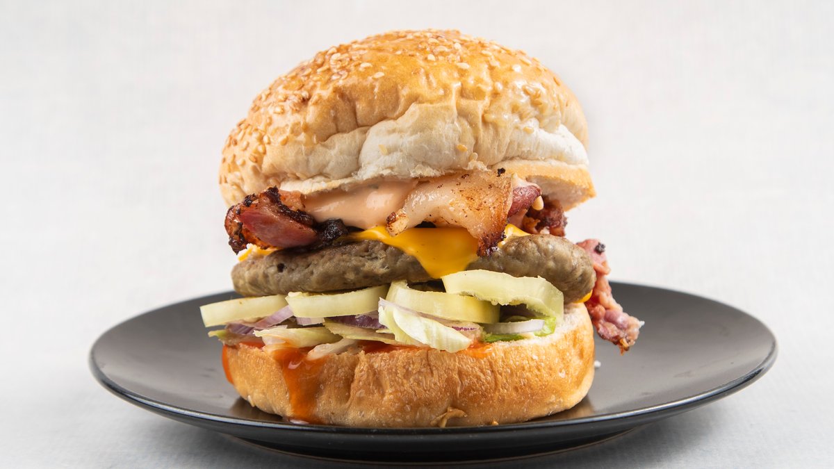 Zemička sa susamom, govedina 90 grama, burger sos, čili sos, crveni luk, iceberg salata, ljuta paprika, slanina, topljeni sir