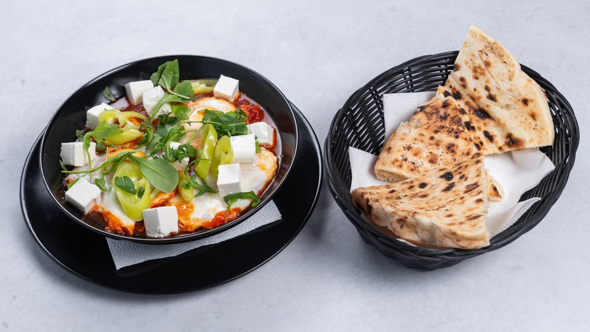 Crni luk, paprika, beli luk, paradajz, peršun, 3 poširana jaja, feta sir, rukola