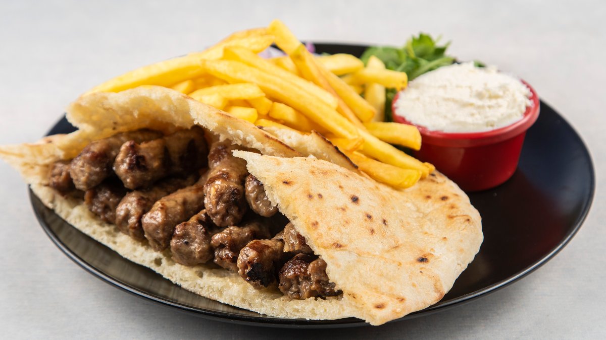 Tortilja, tzatziki, paradajz, crveni luk, zelena salata, pomfrit, pileće giros meso 150g